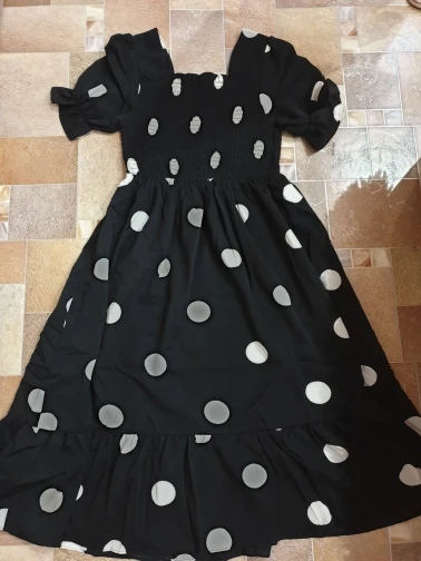 Great dress. At a height of 164 on a couple of palms below the knee. Elastic waist well emphasizes it, sleeves can be lowered, you can wear it so. Pure synthetics, but for its price chic.