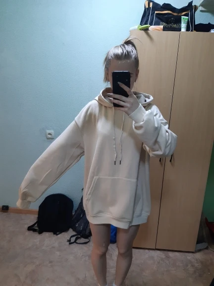 Cool beige sweatshirt! On its parameters 85-66-91 took the size of L to get an oversize. It looks good, not baggy. The sweatshirt itself is very soft and pleasant. And the store put a gift) Thanks!