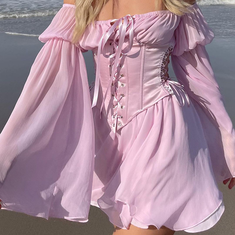 FREE SHIPPING Vintage Beach Style Corset Dress Chiffon Flare Sleeve Dress JKP4845