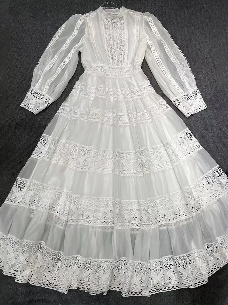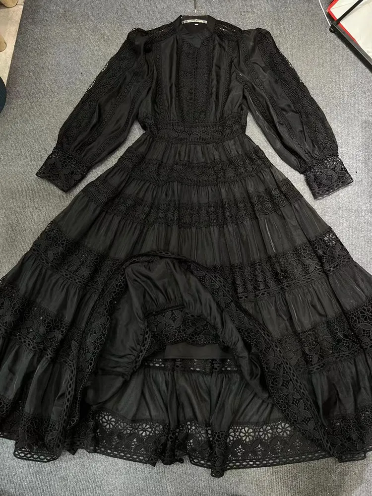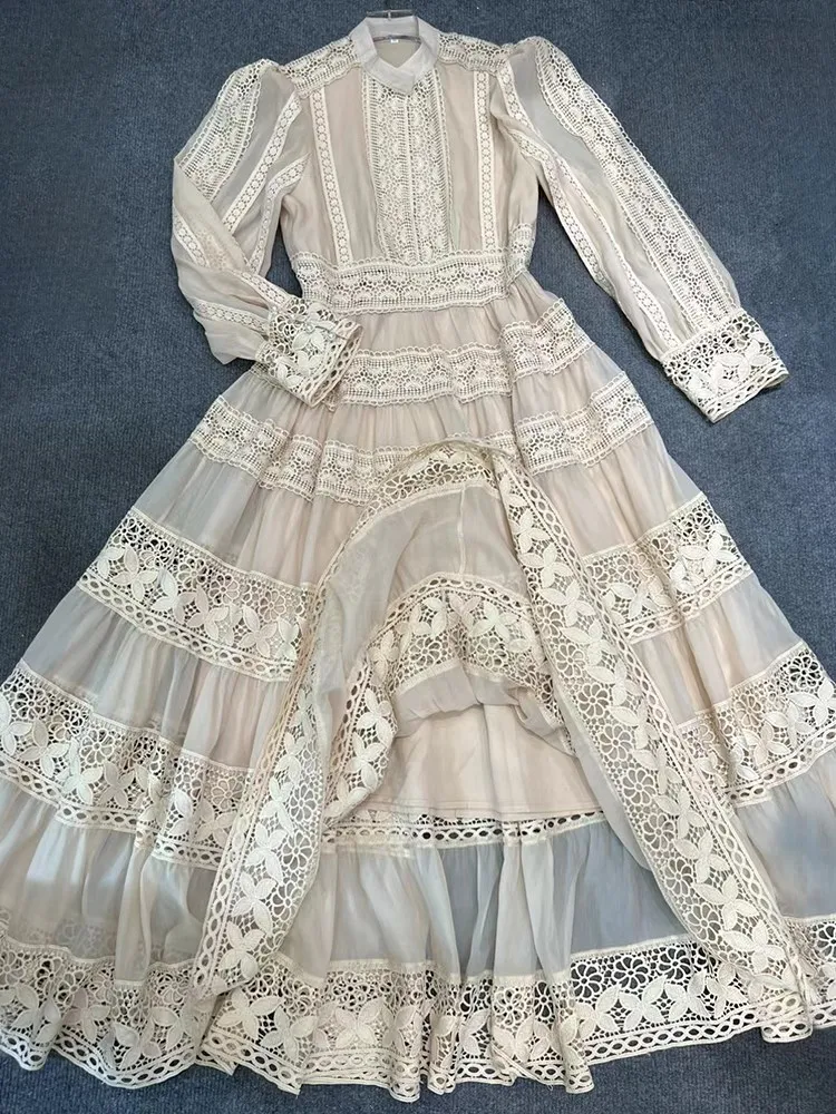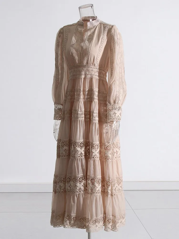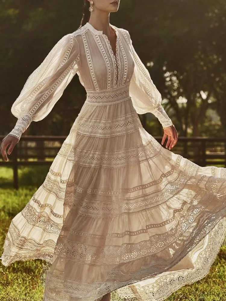 Vintage Boho Lace Maxi Dress Elegant Long Sleeve Gown Hollow Out Embroidery Dress JKP7306