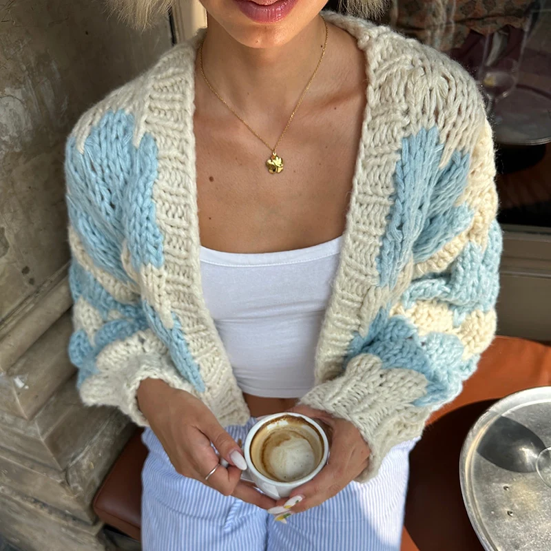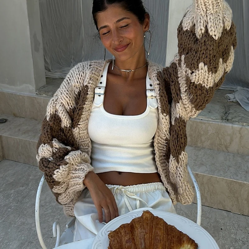 Vintage Stripe Cropped Cardigan Y2K Knitwear with Lantern Sleeves JKP7299