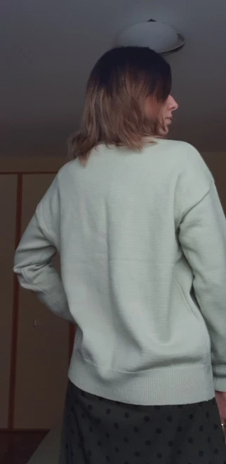 Jacket gentle, due to the fact that in acrylic. Nice color bed light green. Buy happy, sleeve length is good. She wear size S, fit me good, a little oversayz.