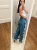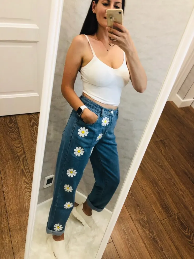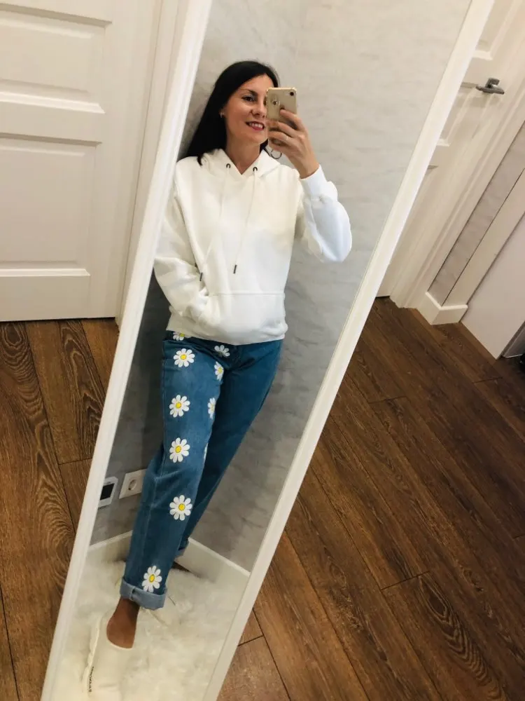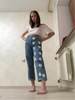 The flowers are on it painted, not printed, so they continue to sit well. The pants has a fine material, not too heavy, beautiful and good communication and fast delivery!