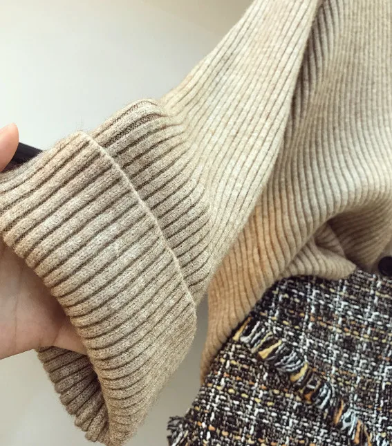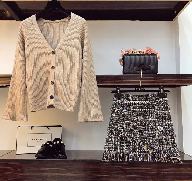 Womans Fashion Set Knitted Cardigan V necked Button High waisted Tassel Tweed Skirt JKP4862
