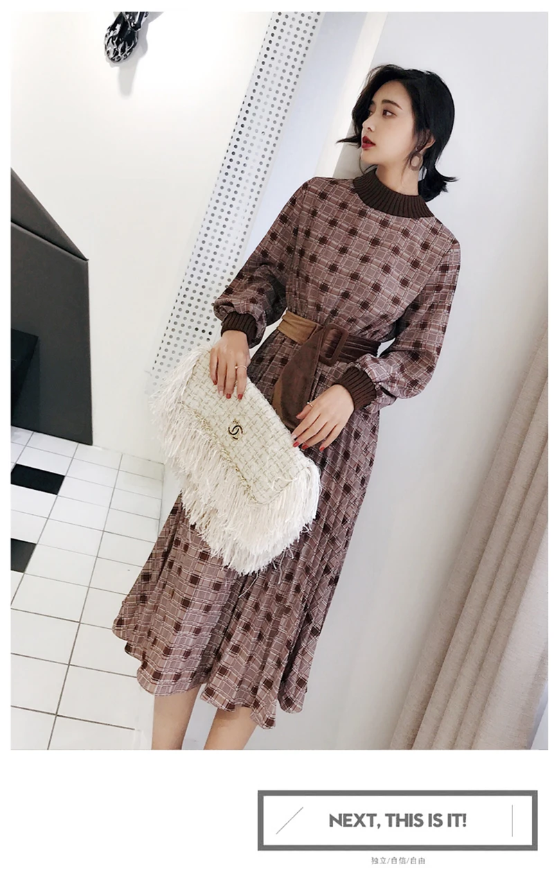 Women Autumn Dress Vintage Plaid Lantern Sleeve Maxi Dress Elegant JKP3873