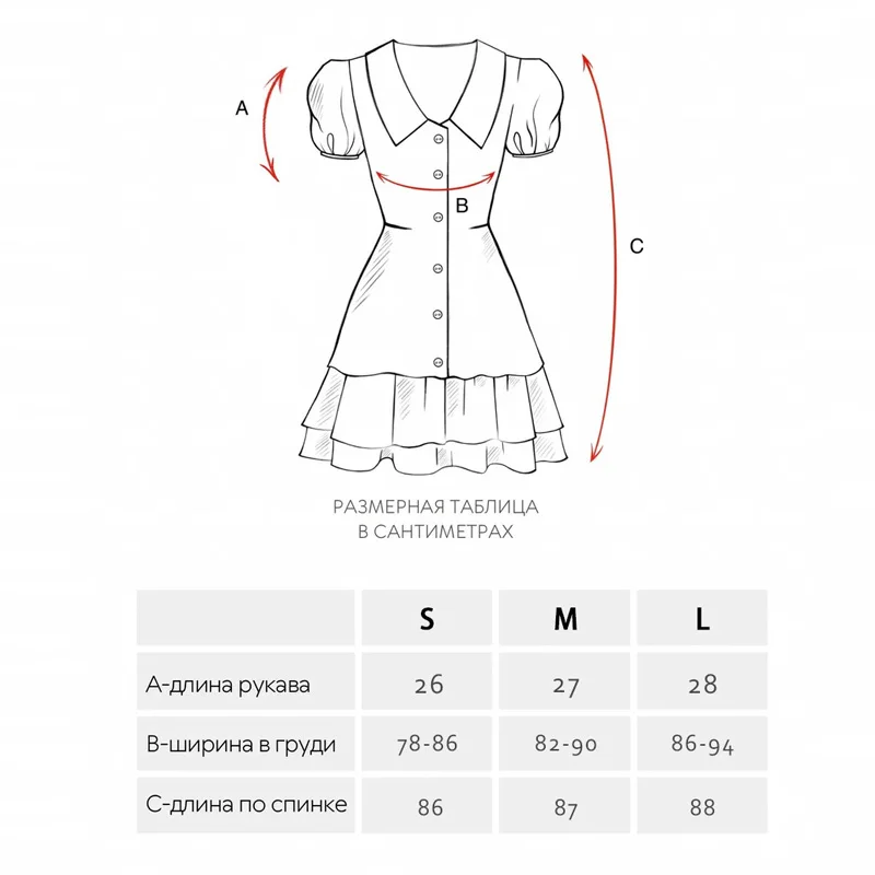 Size L. My measurements are height 170, 94-70-98. The dress is beautiful, well-made, the fabric is thick, of course not suitable for hot weather. One of the downsides is that the lace came separately, the loops for it are too small, even with a pin it's difficult to thread. I didn't communicate with the seller.