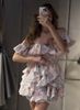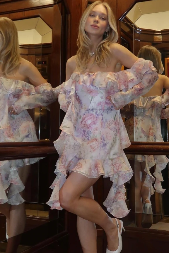 Women Chic Dress Chiffon Elegant Pink Floral Printed Full Sleeve Off Shoulder JKP7317