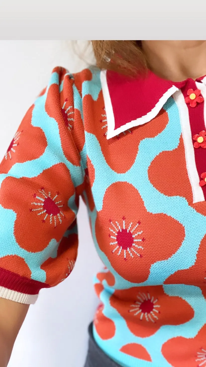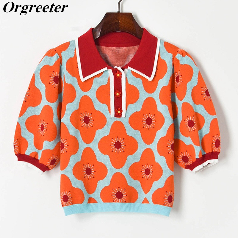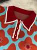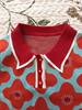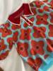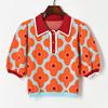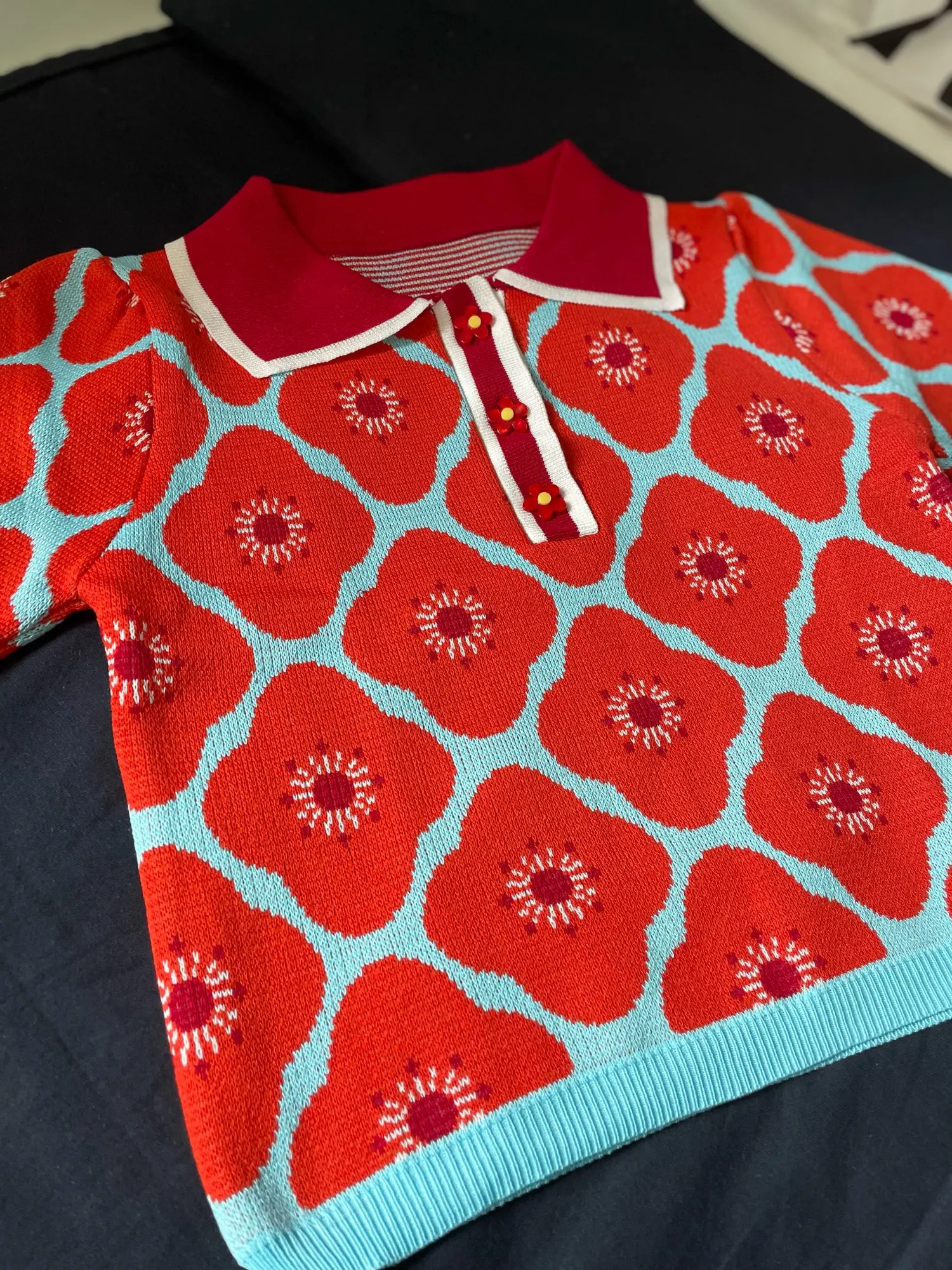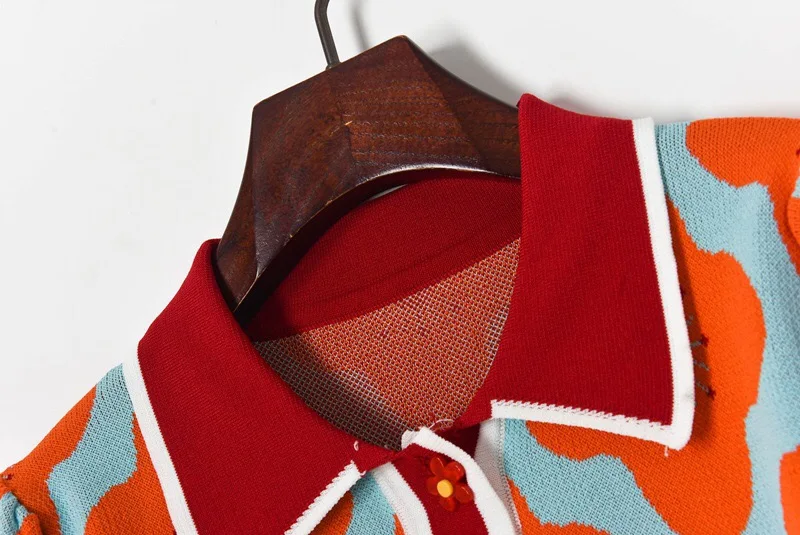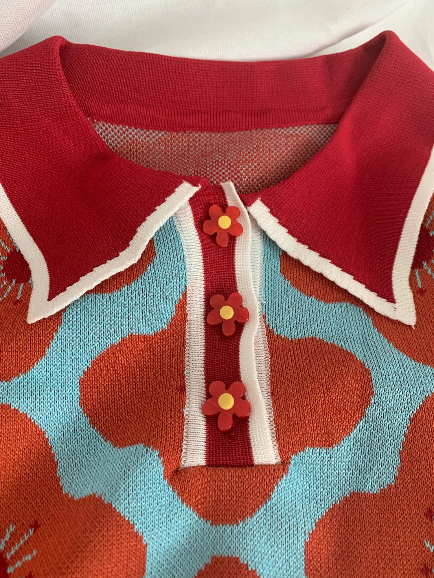Women Chic Flower Button Thin Sweater Summer New Lapel Color contrast Flower Jacquard JKP5863