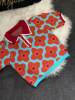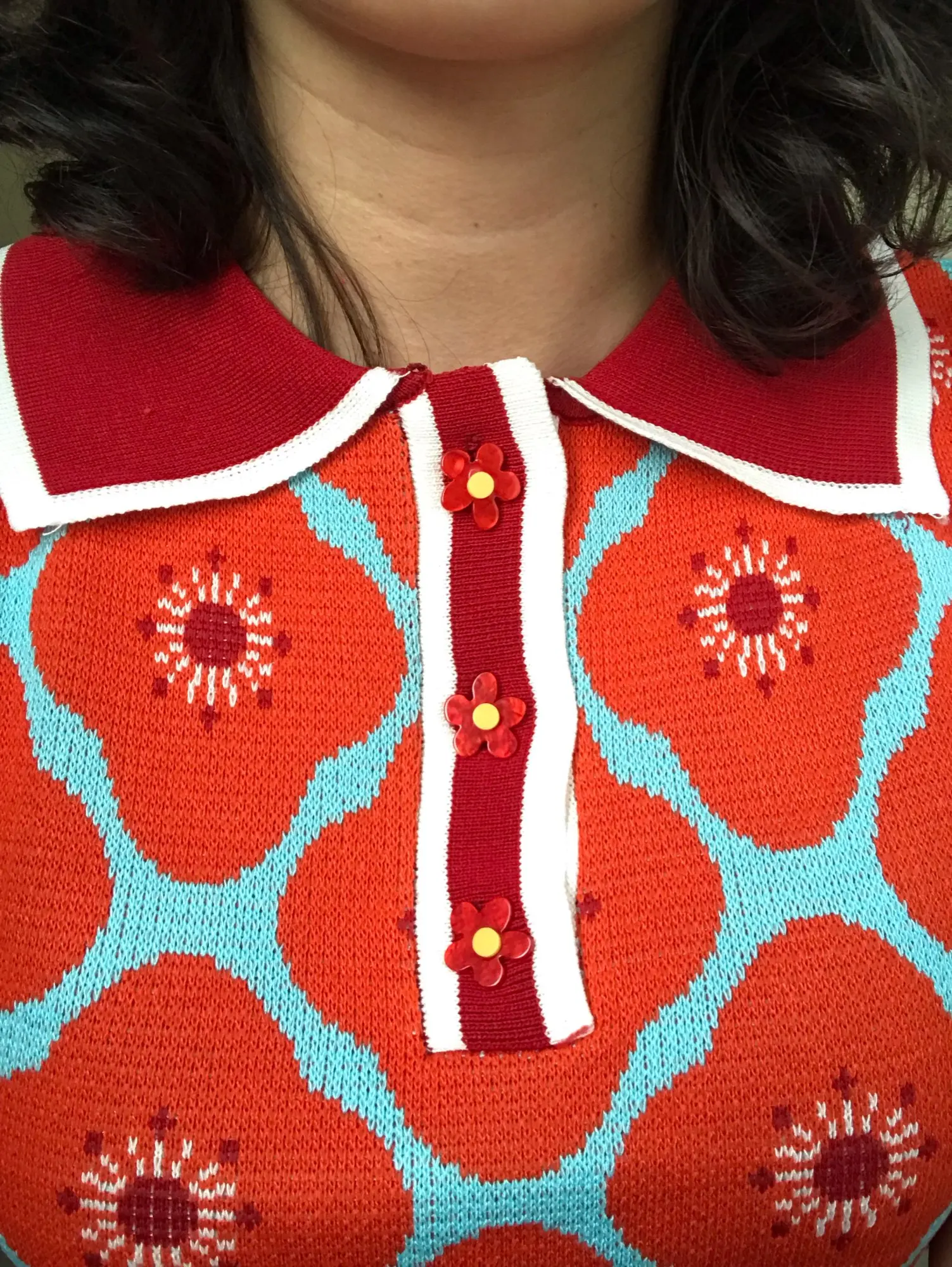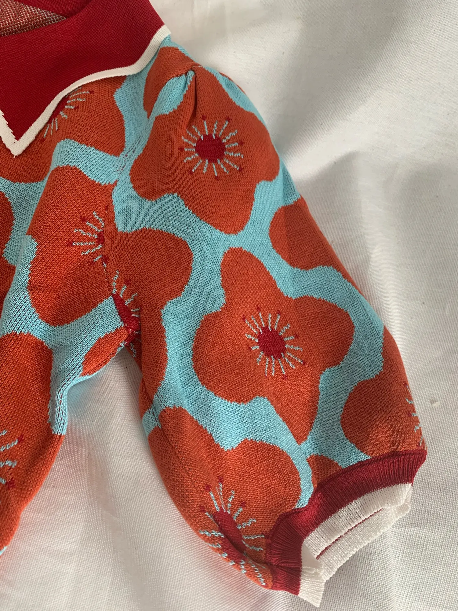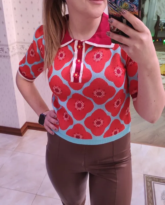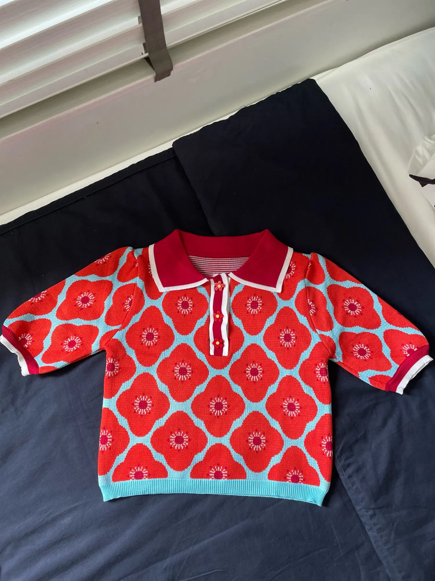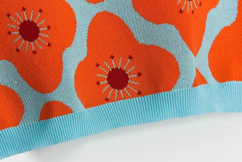 Women Chic Flower Button Thin Sweater Summer New Lapel Color contrast Flower Jacquard JKP5863
