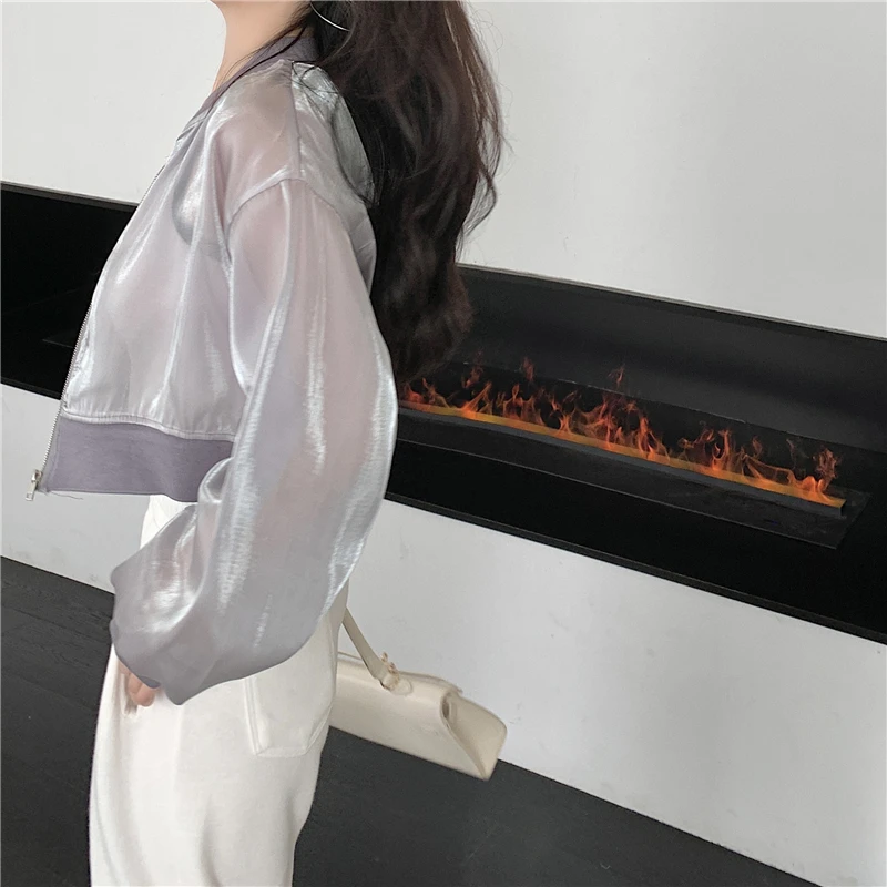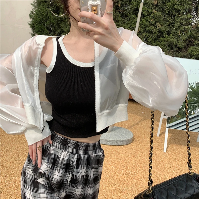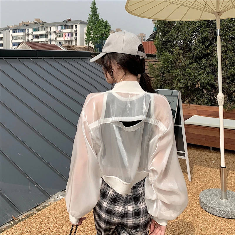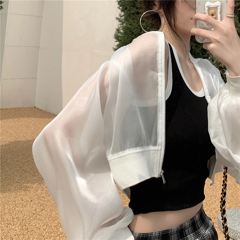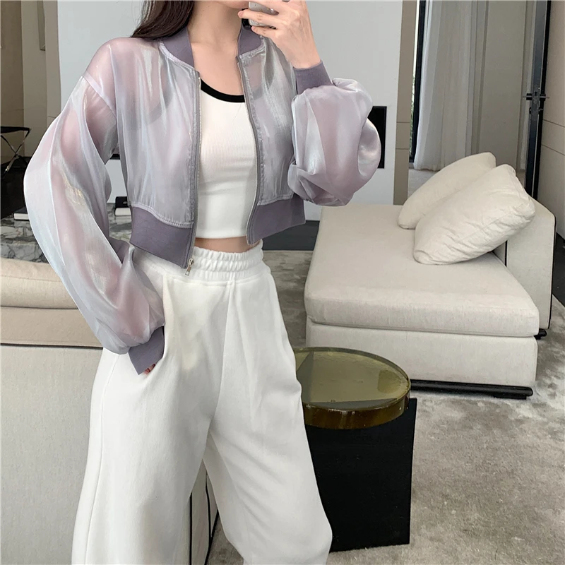 Women Cropped Jackets Zipper Pure Color Semi Mesh Glitter JKP7200
