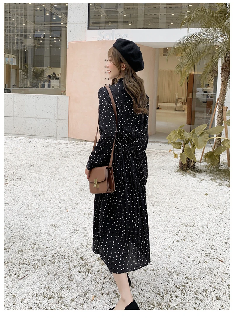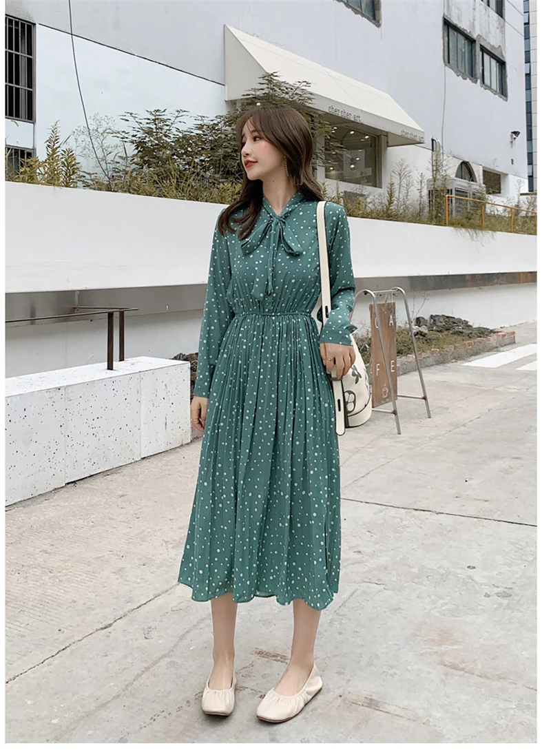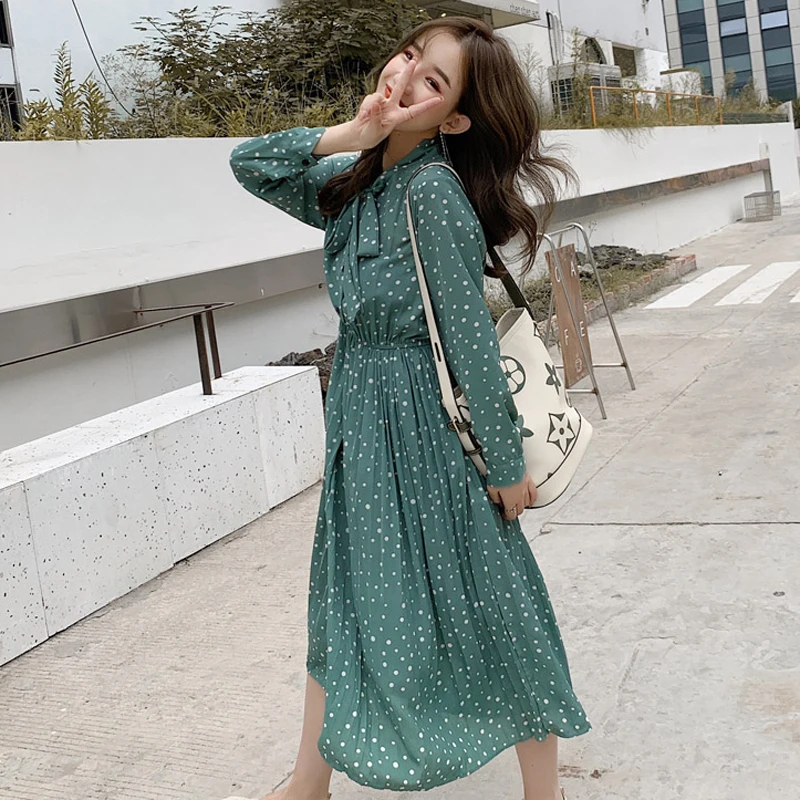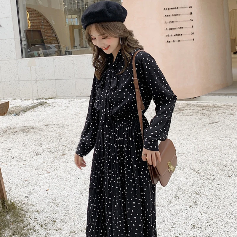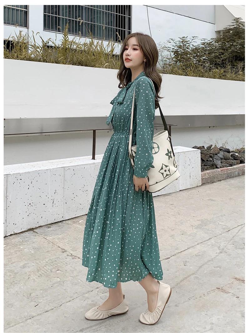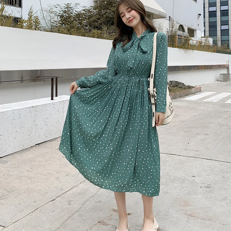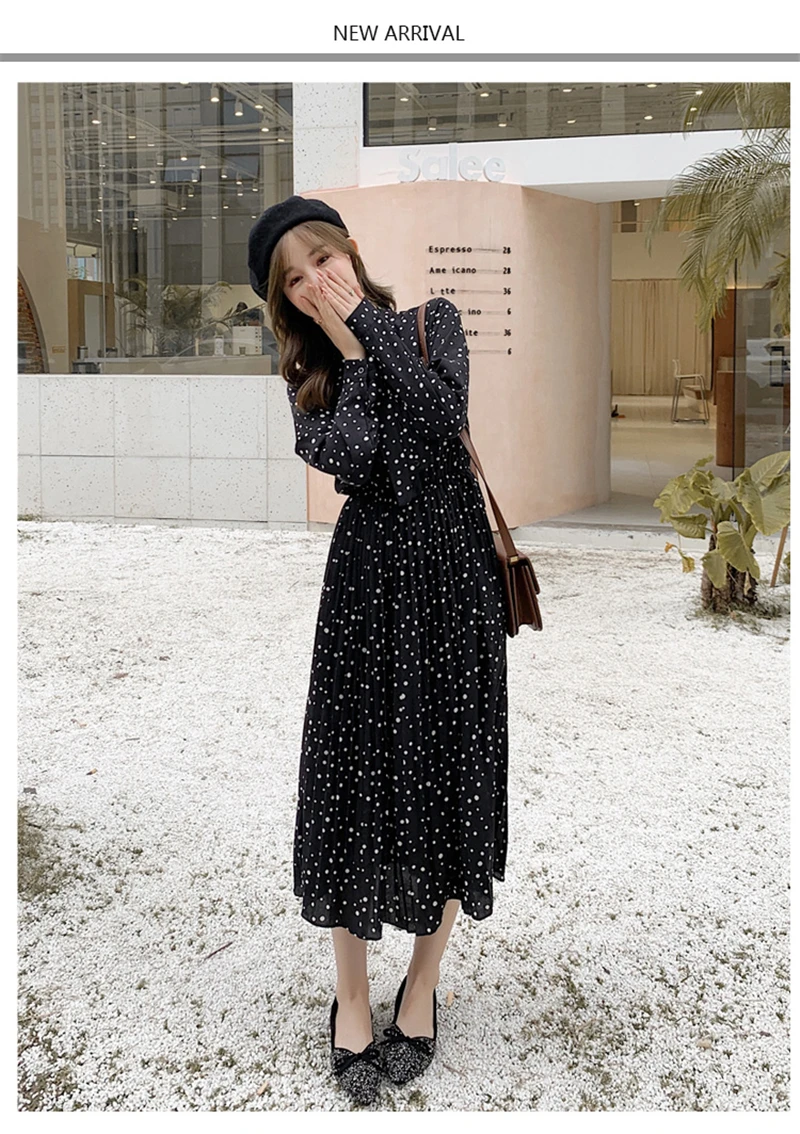 Women Dress Autumn Midi Polka Dots Dress Full Sleeve Elastic Waist Chiffon Pleated JKP3870