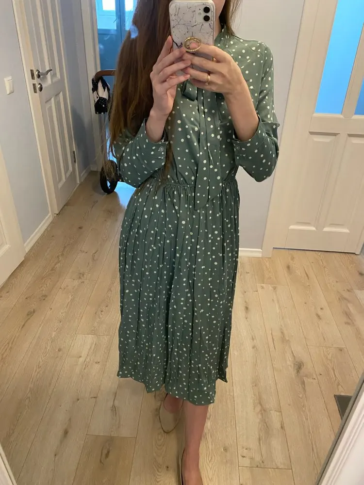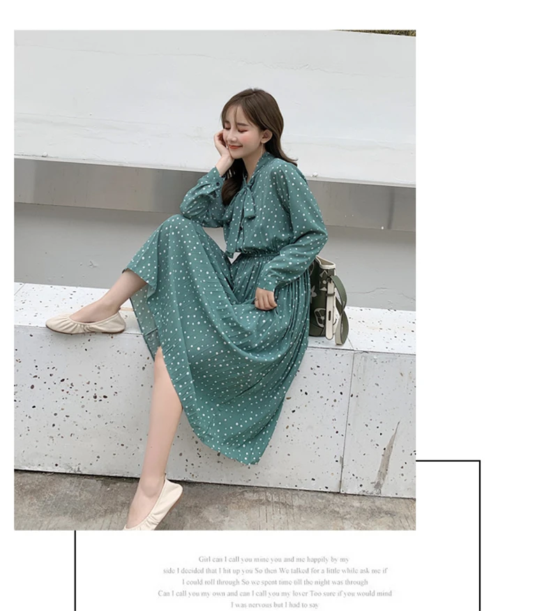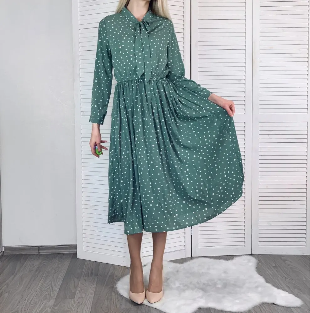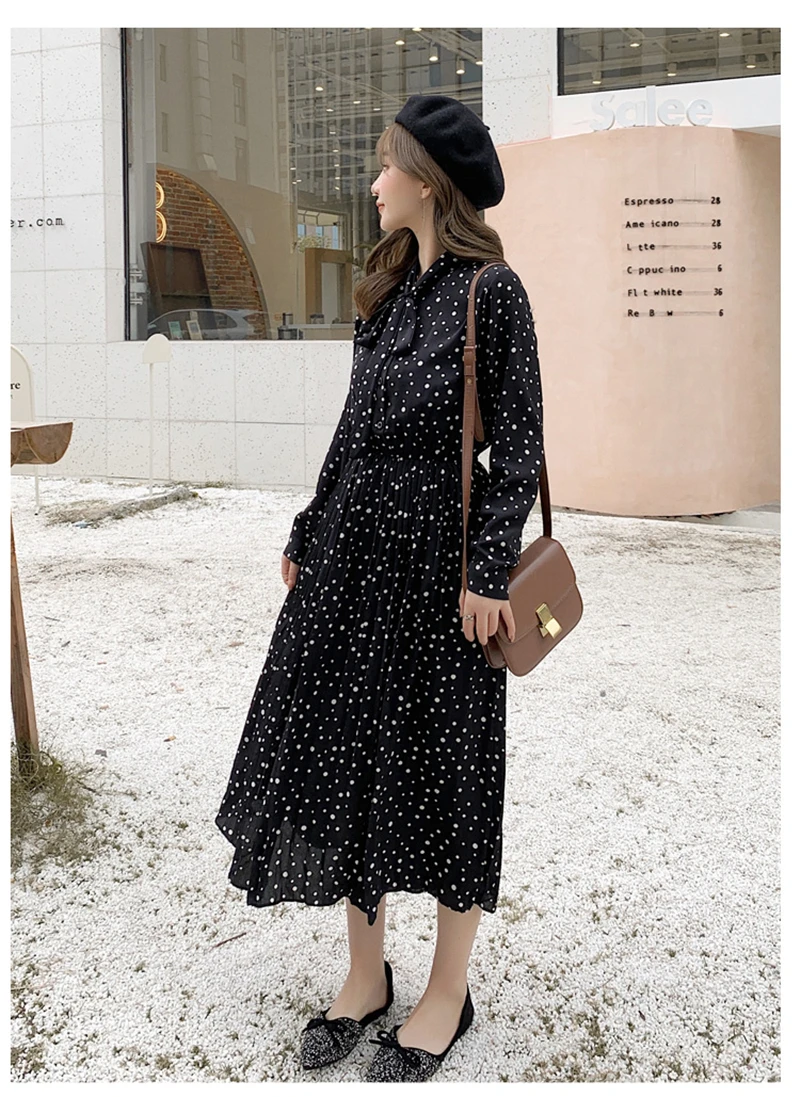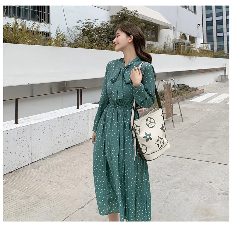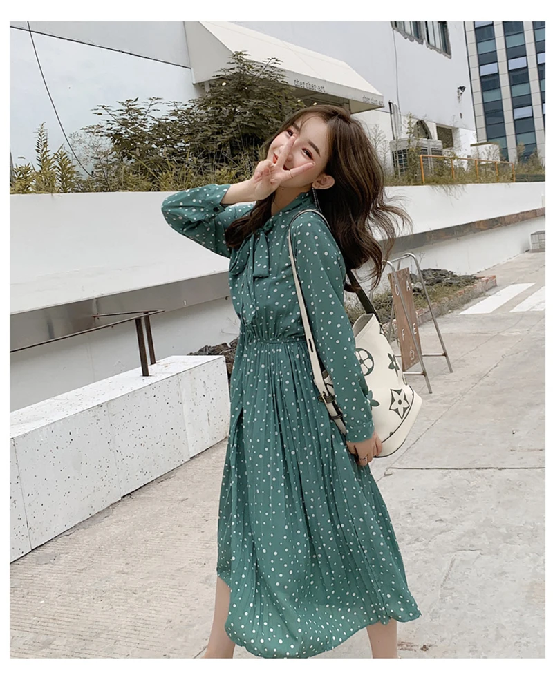 Women Dress Autumn Midi Polka Dots Dress Full Sleeve Elastic Waist Chiffon Pleated JKP3870