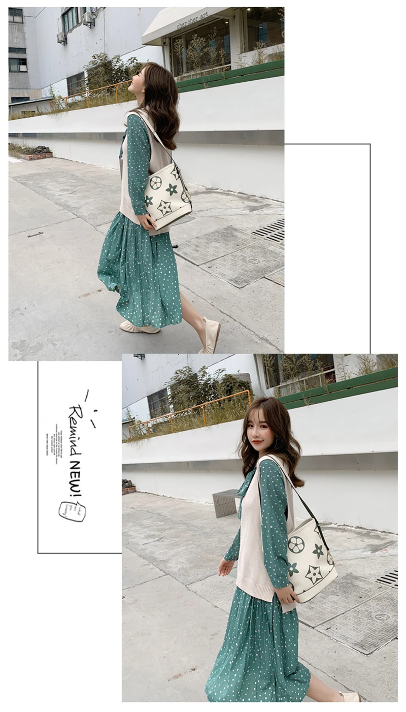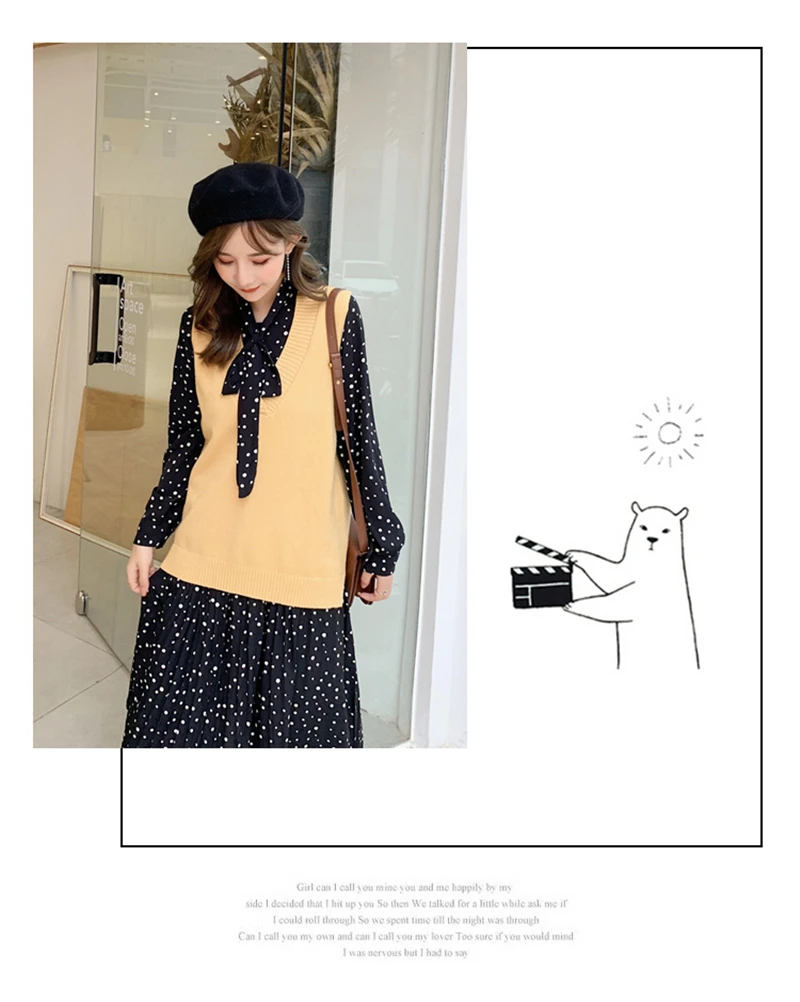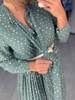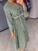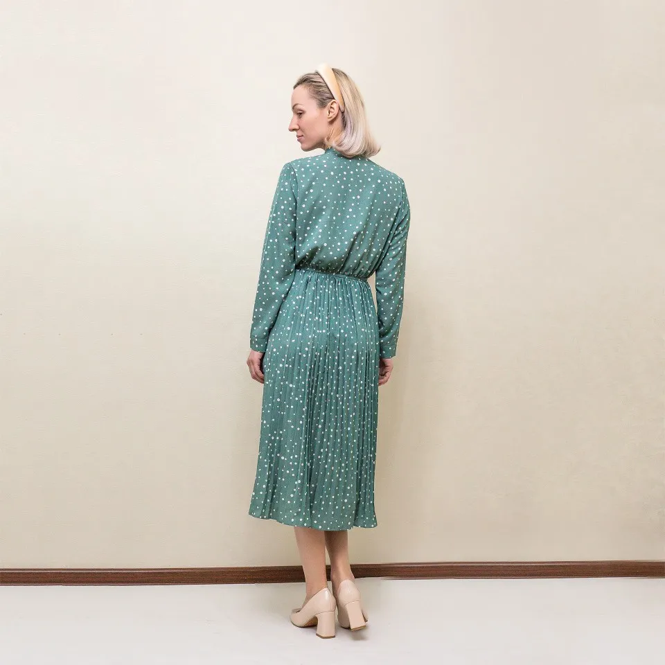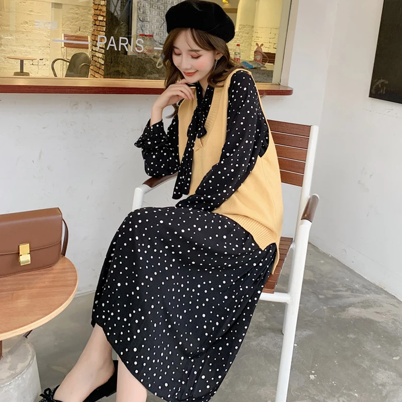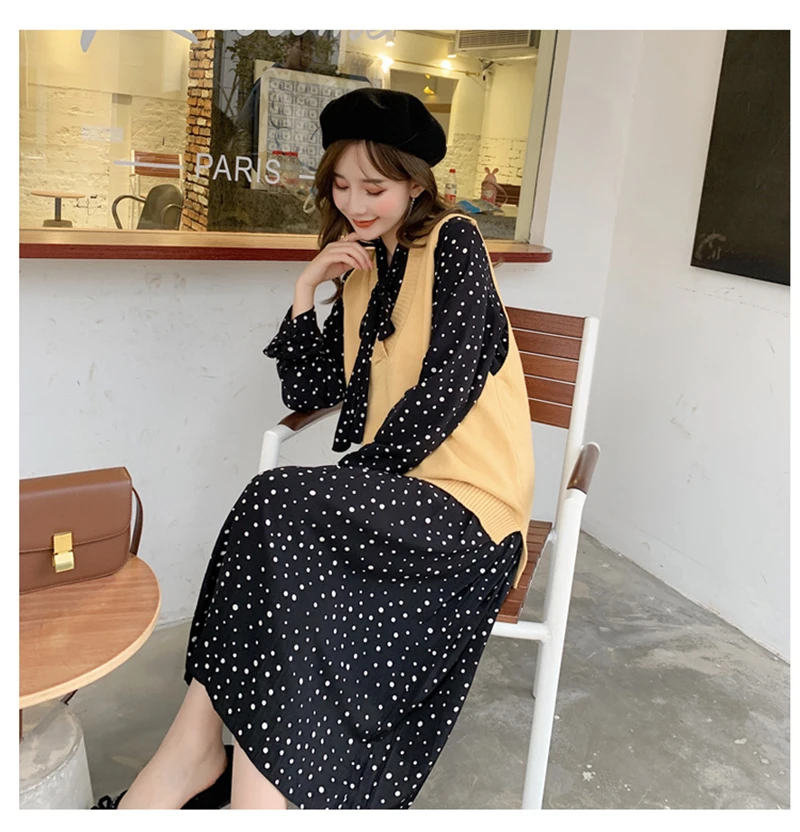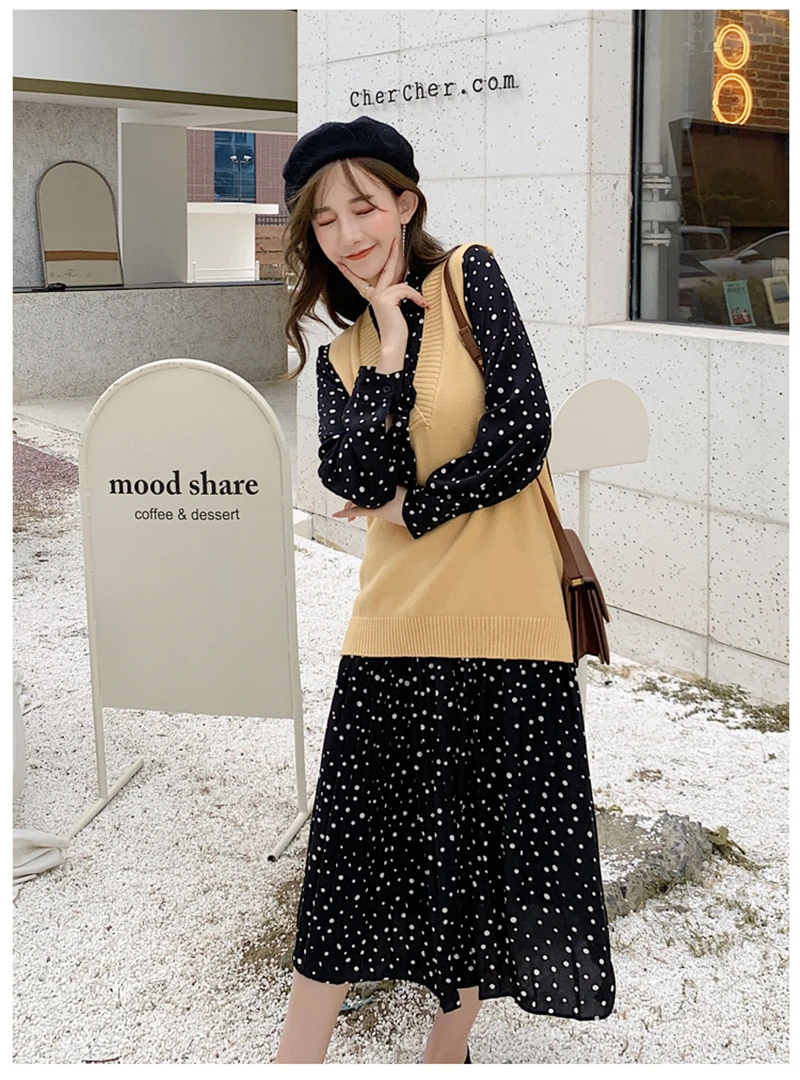 Women Dress Autumn Midi Polka Dots Dress Full Sleeve Elastic Waist Chiffon Pleated JKP3870