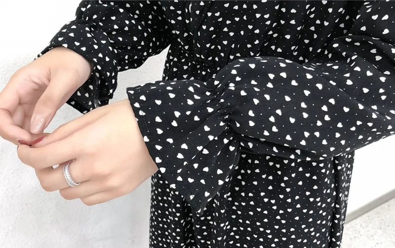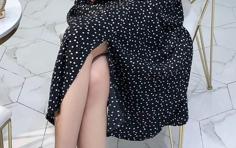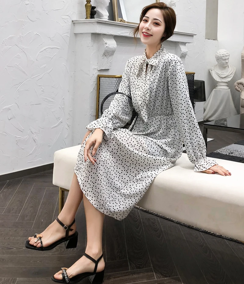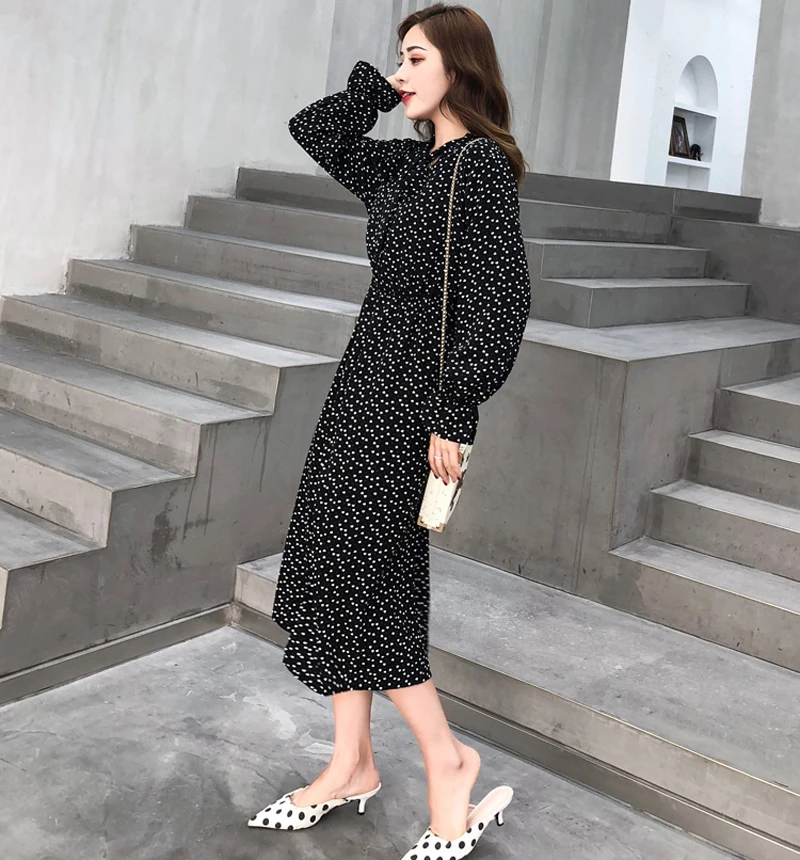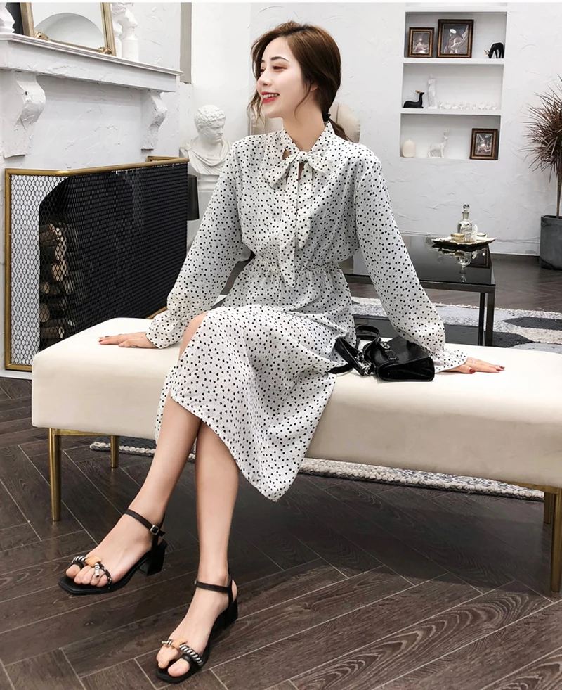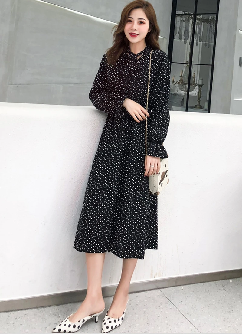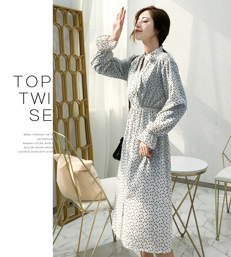 Women Dress Elegant Stand Collar Polka Dot Flare Sleeve Side Split JKP3867