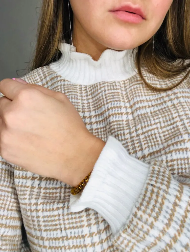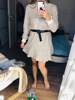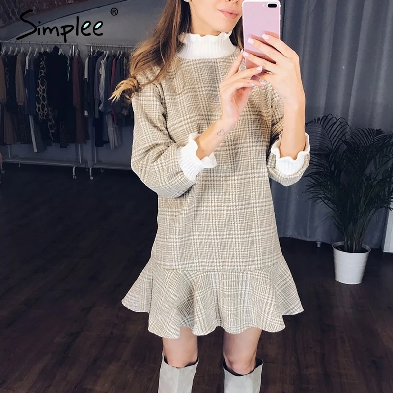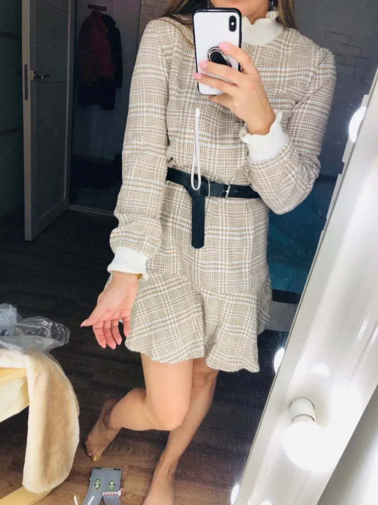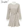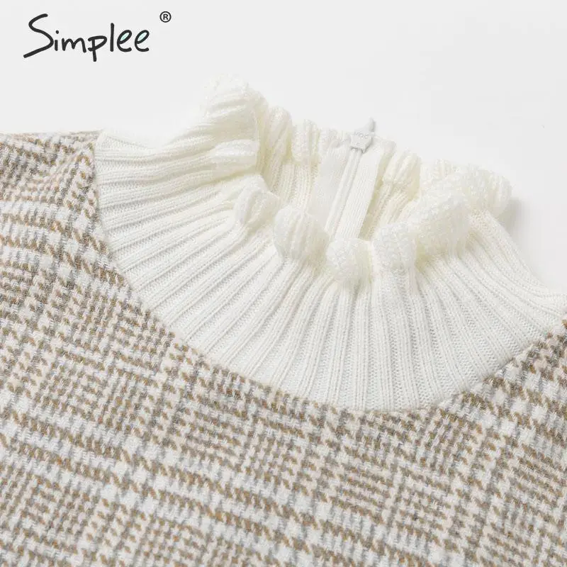 Women Elegant Plaid Dress Turtle Neck Knitted Short Dress Ruffle Sashes Vintage 90s Outfits JKP3820
