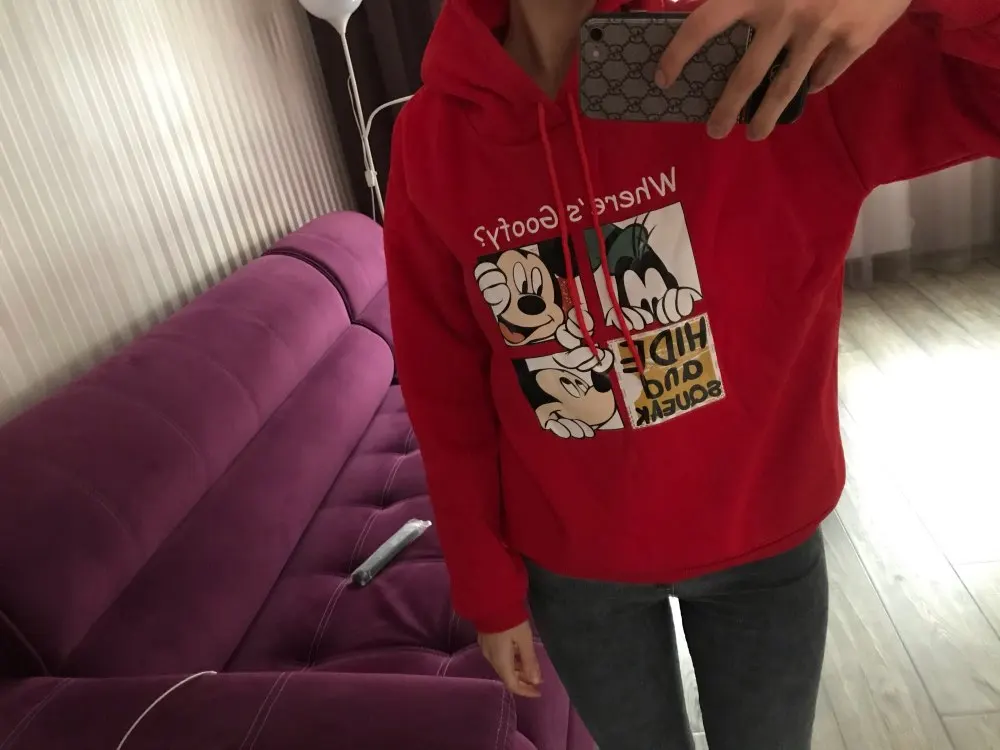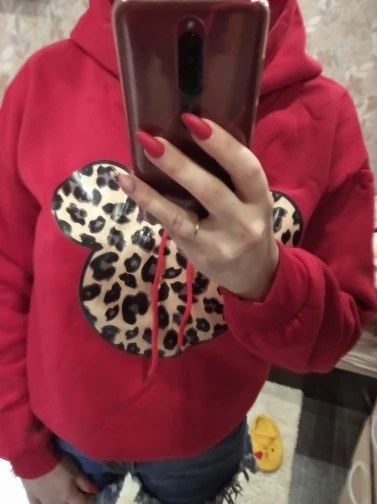 The sweatshirt is just super! Of course, it is 100% synthetic, but it is very soft, cozy. On size M (height 171, shoulders 41 , 84/58/92 and long hands) ordered 2 HL, looks like oversized, sleeves are not short, Hood is great, the color is exactly as the picture! The pattern is clear. Ironed the sweatshirt through the gauze on the medium heated iron. In general, a lovely sweatshirt