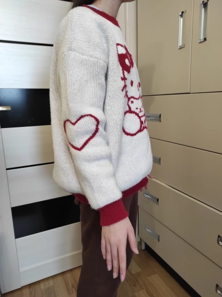 very cute!! surprised by how good quality it was! very thick and warm, good for winter, definitely recommend this especially for the price!! only complaint is that the sleeves were really short for some reason. i purposely got it in a size large for an oversized fit but the sleeves just reach my wrists. if u want the sleeves to go over your hands like in the picture make sure you size up by a lot!! other than that its perfect :)