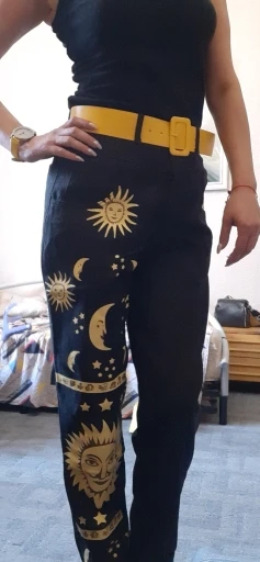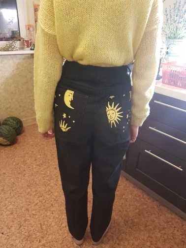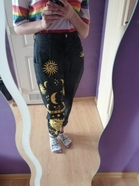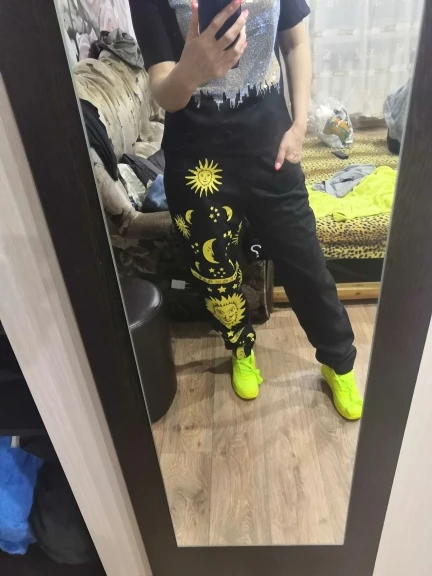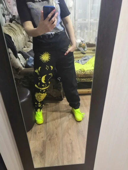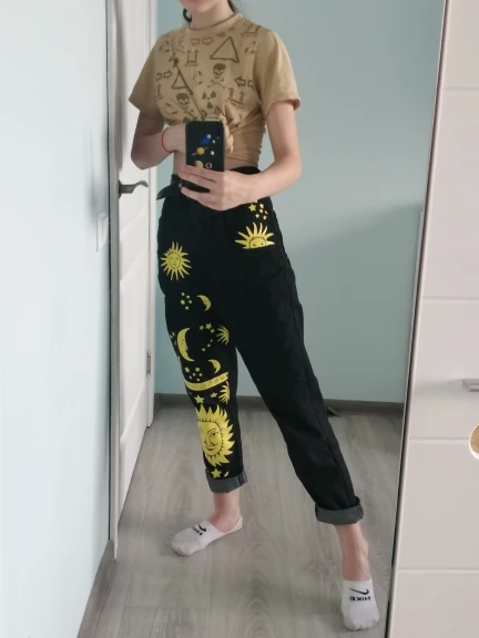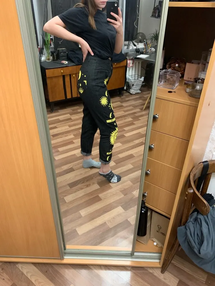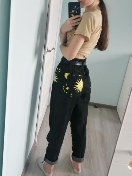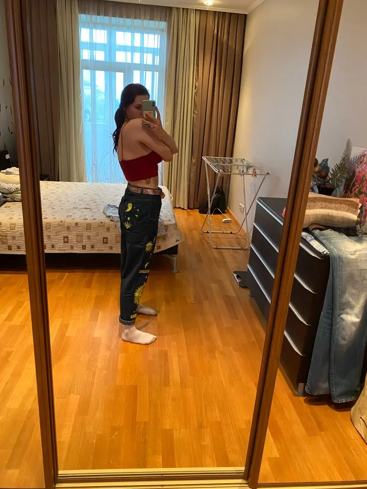 This is straight jeans for the ribs when I got out of the package, I was upset, I thought with the size did not guess, too long, too wide, in general I thought I would have to suture and shorten, but!!! After dressing, I realized that everything was planned☝Very steep, print clear, bright, all as in the photo