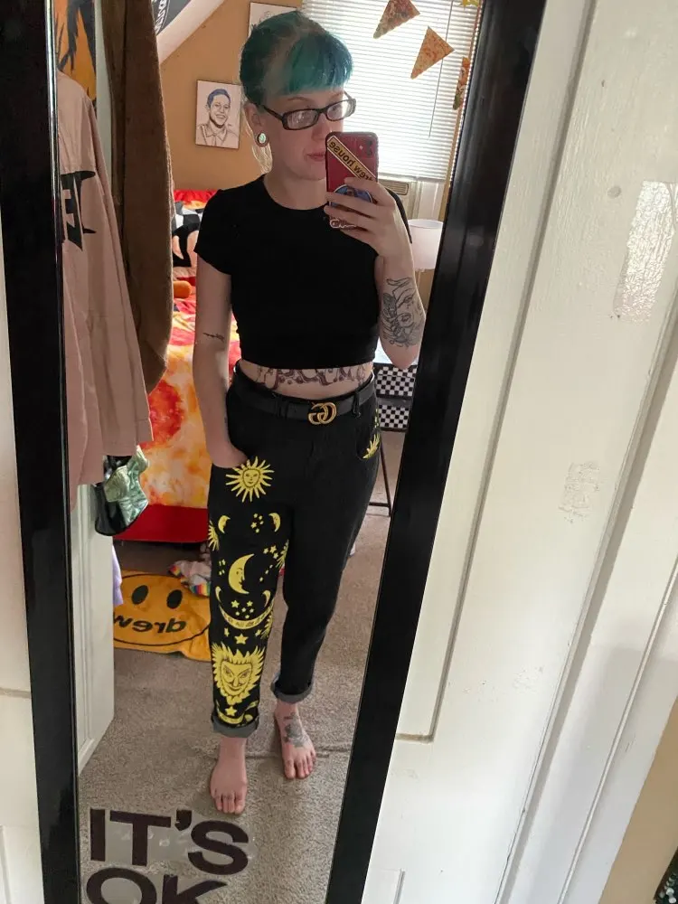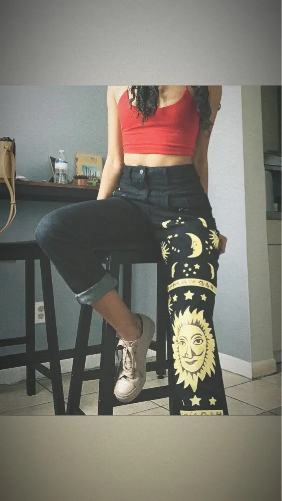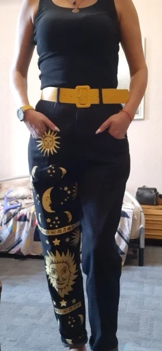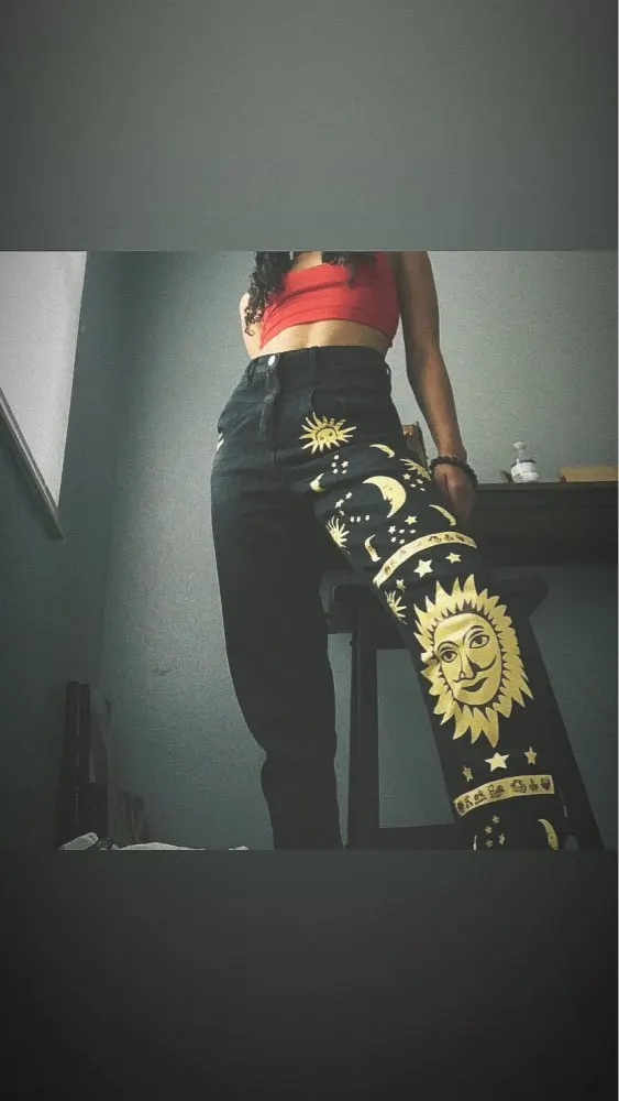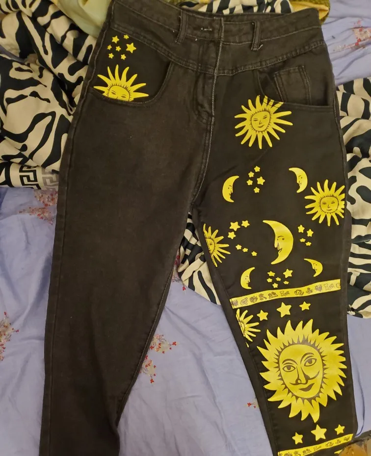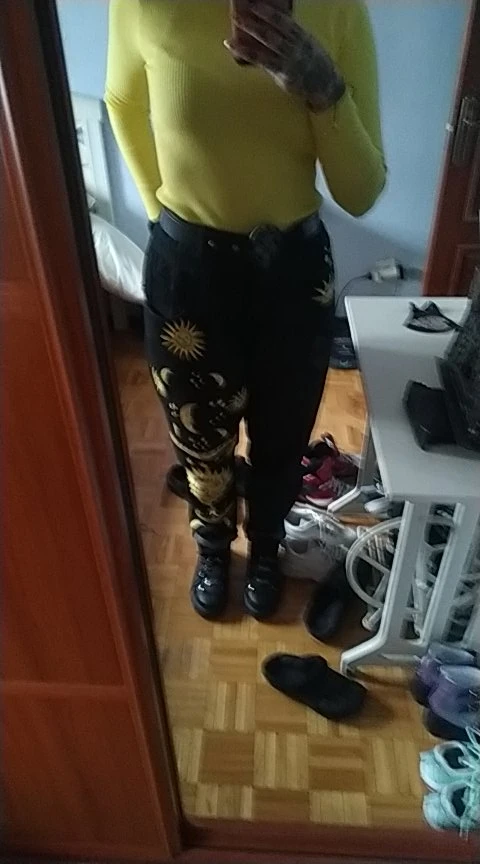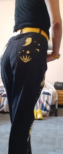 This is straight jeans for the ribs when I got out of the package, I was upset, I thought with the size did not guess, too long, too wide, in general I thought I would have to suture and shorten, but!!! After dressing, I realized that everything was planned☝Very steep, print clear, bright, all as in the photo