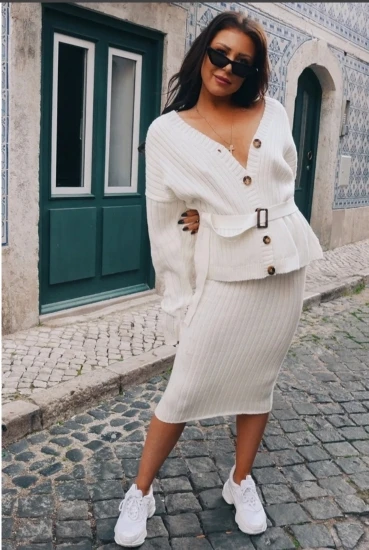 Women Knitted Sweater Dress Elegant Autumn Winter Two Pieces Skirt Suit White Long Sleeve JKP3821