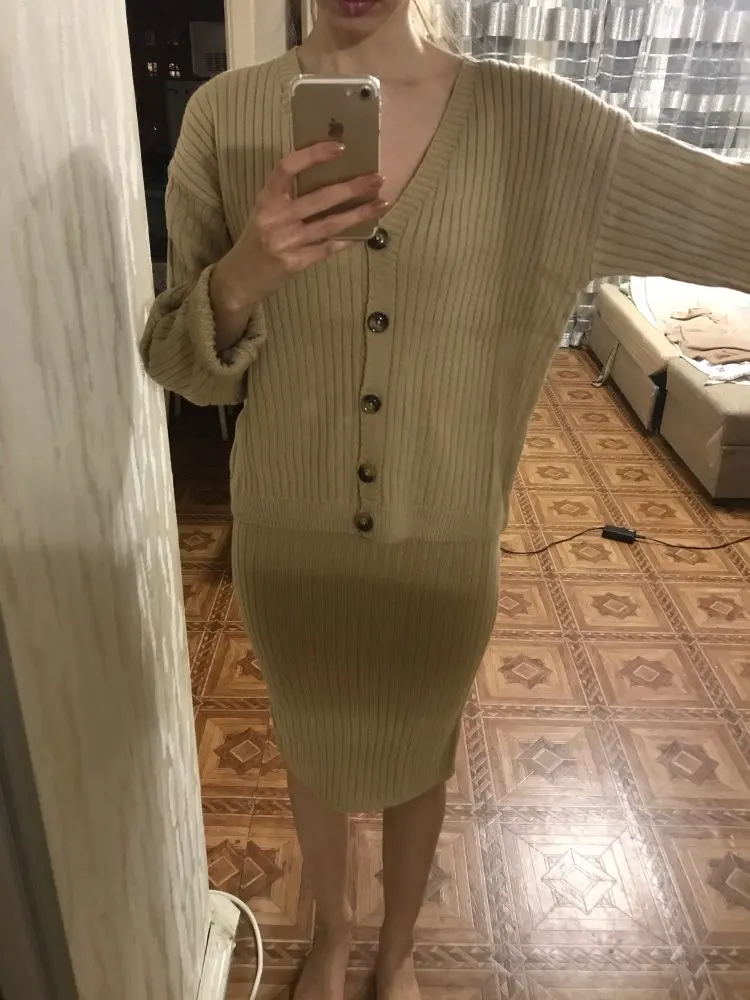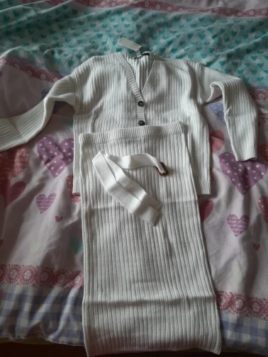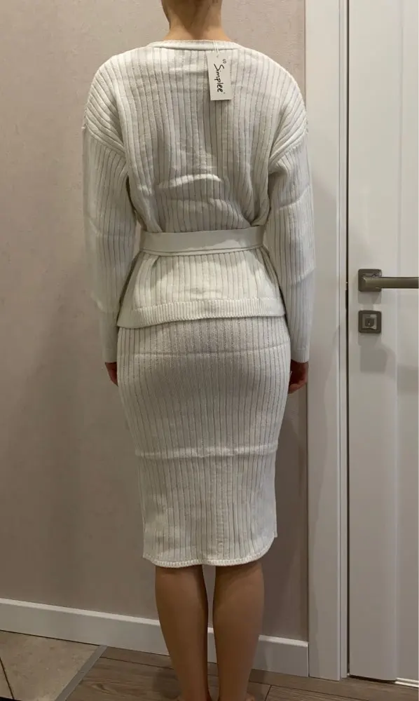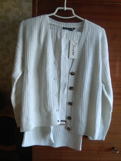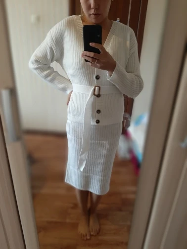 The order was sent quickly. But delivered two months. The store's fault is not in this. Thanks to our ukrmail. Two weeks the parcel was held in Kiev and another two weeks already in Odessa. The seller is clever, twice extended the protection period of the order, was in touch. And now about the order itself. My expectations were simply rewarded. The suit is just great. The quality is fine, the threads do not stick out. Color white. Size M on the parameters og 96 from 76 OB 104 came up perfectly (wear L or XL). Nowhere presses, sleeves just. There's a belt. Knitting is not dense. A cardigan and a skirt can be mixed with other things. I recommend the seller and the product. Buy, you will not regret.
