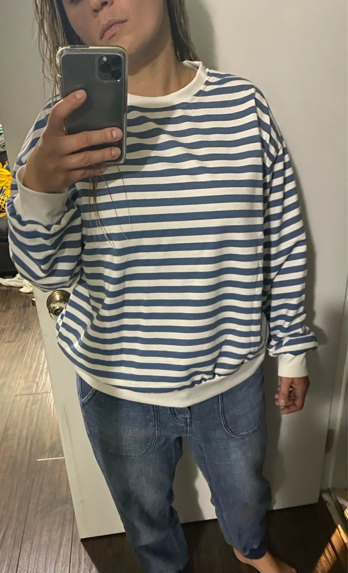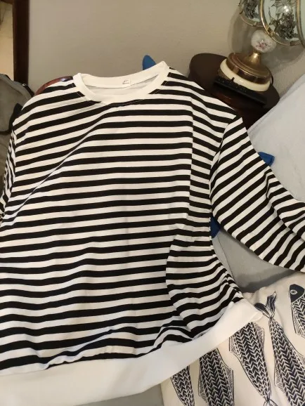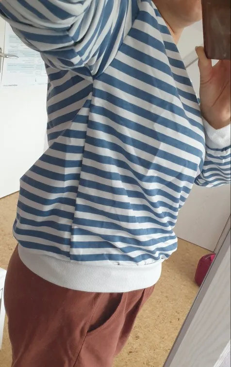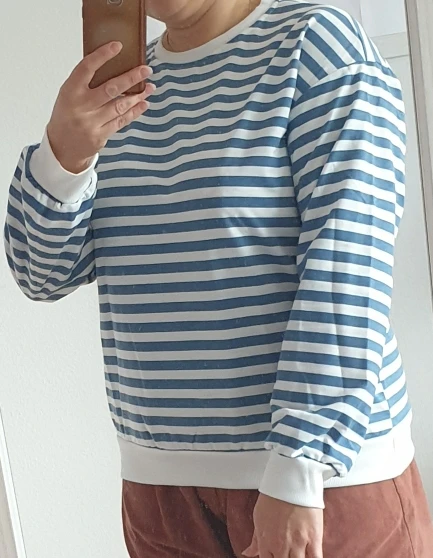 This is not a sweatshirt, rather a T-shirt with a long sleeve. But the quality is good, all the seams are even, sewn neatly. On our M-L took XL, because I wanted an oversize, it does not sit as freely as on the model, but in general a good oversize. For this price is a great thing!
