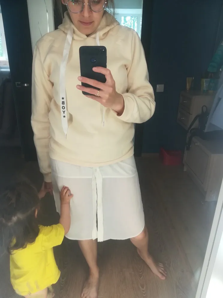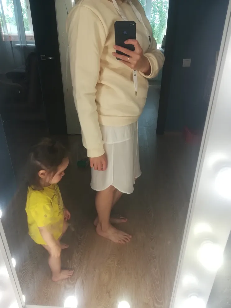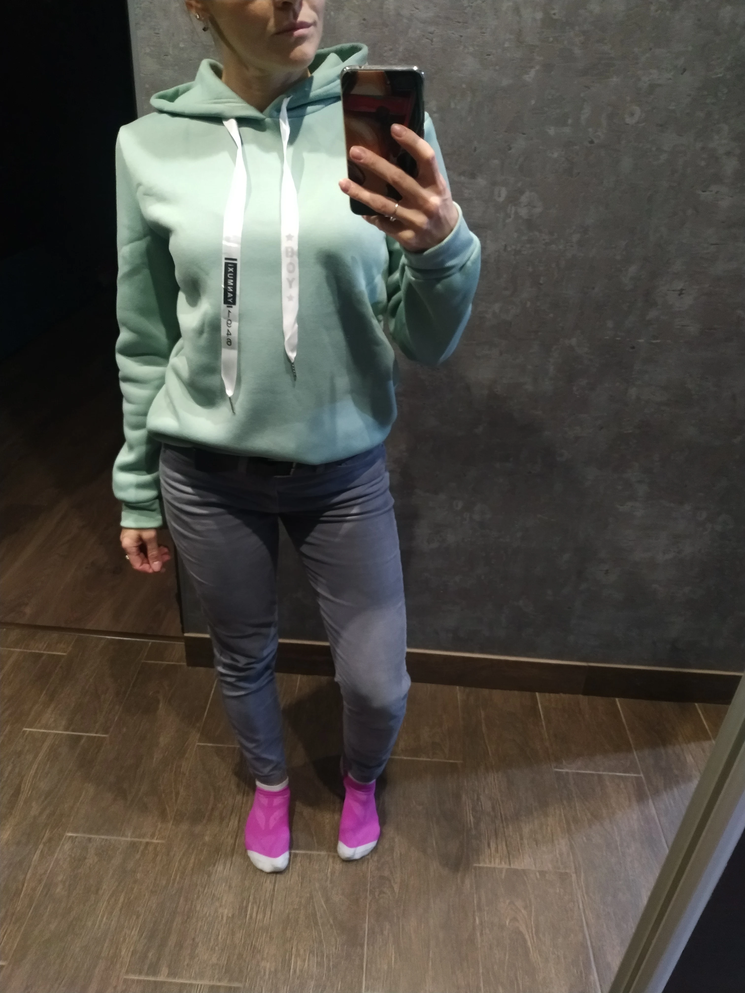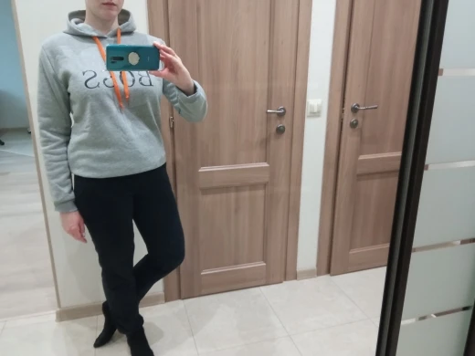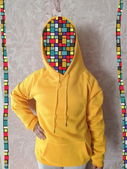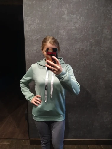 The sweatshirt sat down well. My height is 170, I wear 46 from above. I want to note that the hood is too small: When you put it on your head, the whole sweatshirt rises. In the straightened form, the product reaches the buttocks. Kuliska immediately removed, upgrade his bright. Composition: 65% cotton, 35% polyester. On a cotton T-shirt will be comfortable. It should be noted that the delivery is very fast: 12 days to the Moscow region.