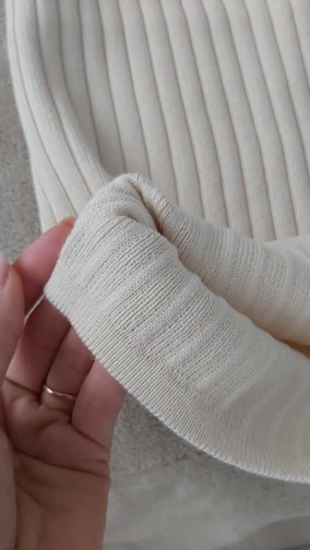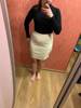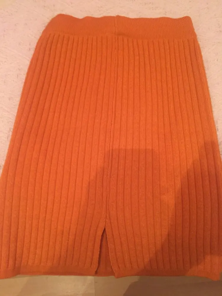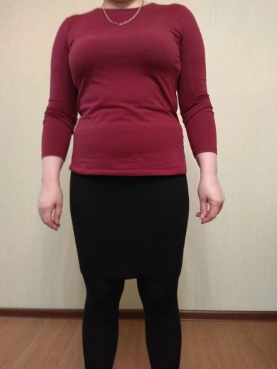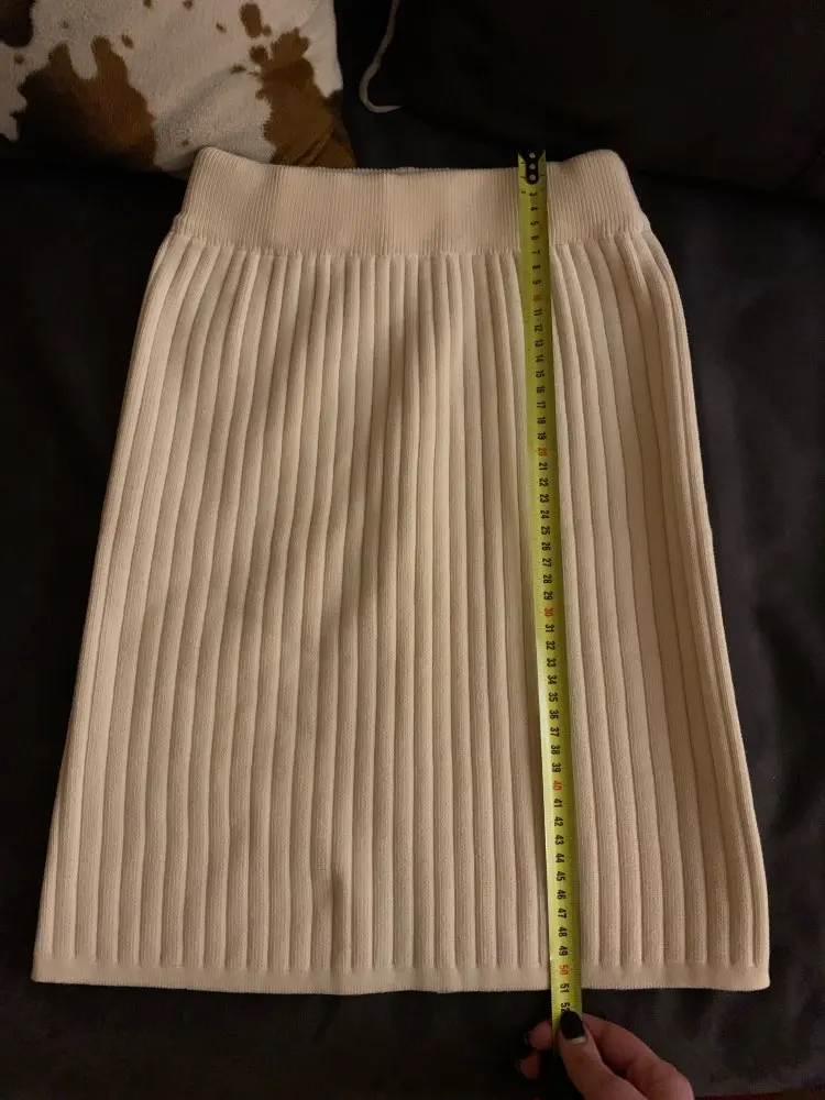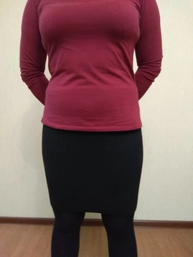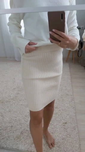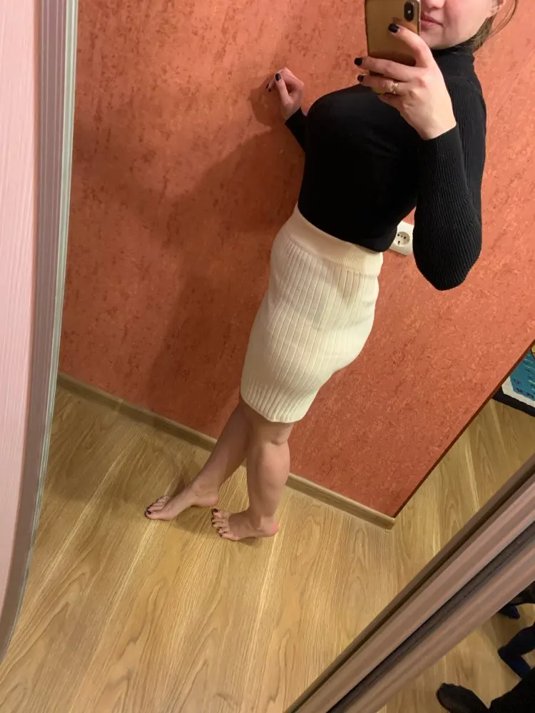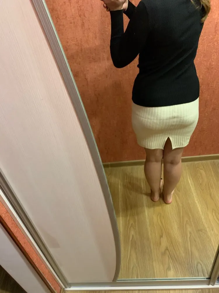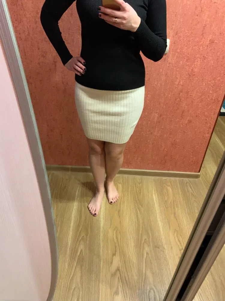 Warm, dense, factory skirt. The seams are even, nothing sticks out. No smell. Everything is perfect. On the skirt, small strips of dark color (like sewing marks), but not bright and I think easily washed off. On the growth of 165, ot-70, ob-89 sat well. Length above knee. But keep in mind that it fits the figure due to the style, so all errors (in my case, the stomach (the lower press, which is not :)) accentuated the skirt well). But you can cover with a sweater or jacket and so on. The skirt is happy) the color is beige, not Milky (for comparison my sweater in the photo of milky color). I bought at 11.11 discounts for 462 rubles. Before Kazan for 2 weeks. Straight super! Recommend product and store)