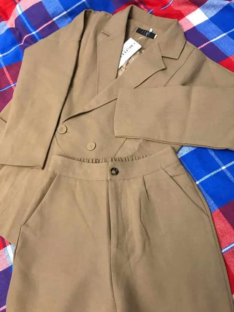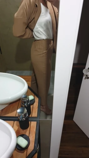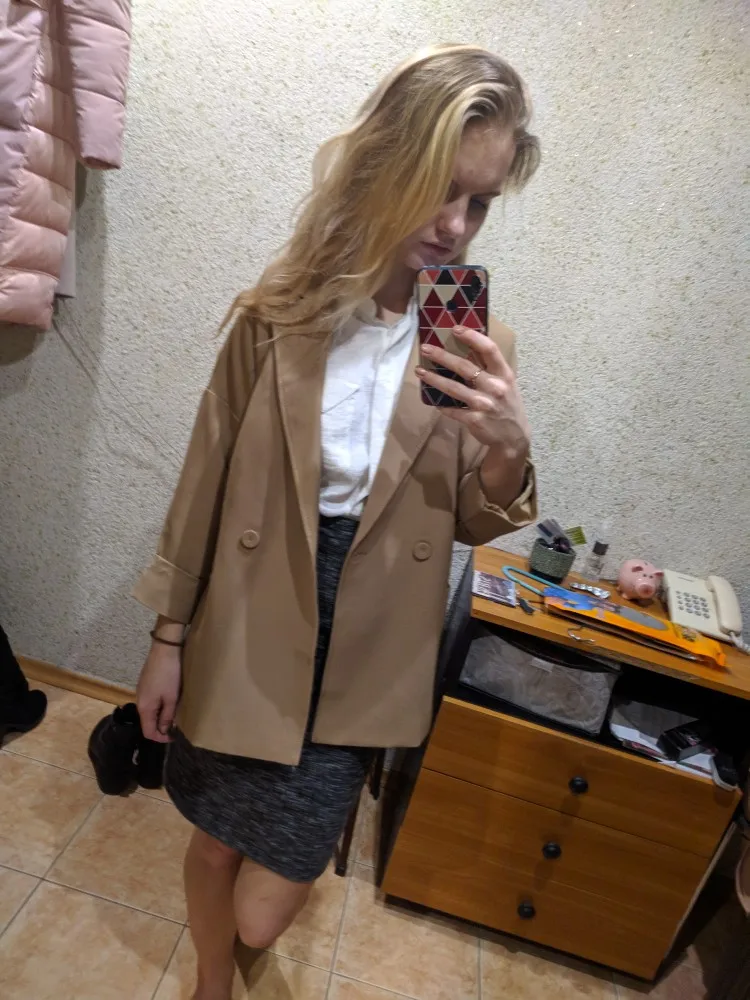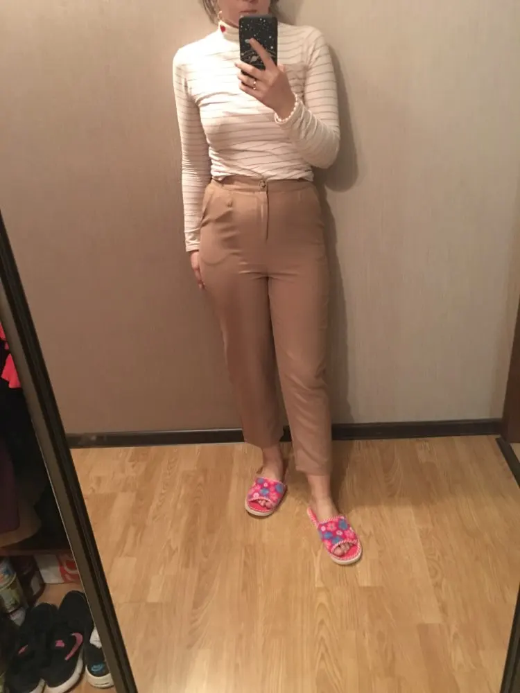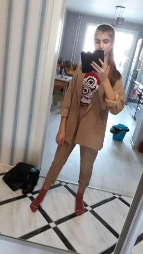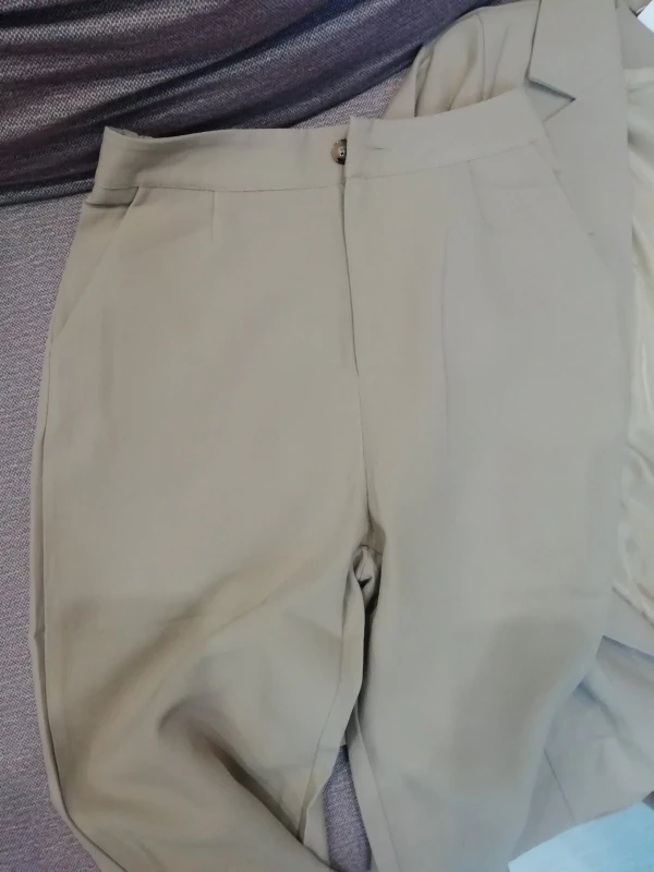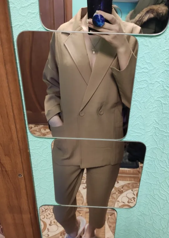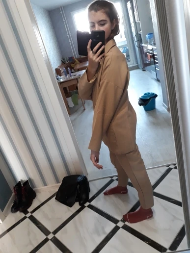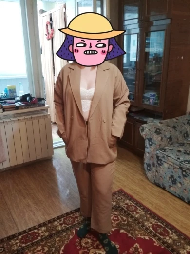 Bomb suit. It was only a long time, but it was because of our mail, because it was very long. The fabric is pleasant to the body, everything is sewn, exactly, the buttons are in place, strong. I was very afraid that I would lose with the size. No, everything is very clear! Height 159-trousers on the ankle, I.E. Very slightly shortened. The girl will be shorter than height. Pants sat down otpadno, nothing presses, behind there is a rubber. In general, in the plans to lose a little, but even in this case, I think, will sit as it should. Oversized jacket, deflated sleeve. Rolled up without problems, you can and so wear) waist 73 hips 105. Took XL. I highly recommend, comfortable, beautiful, modern suit in basic color. Happiness is no limit!