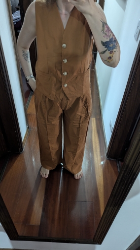 The suit is very nice. Fabric and accessories of excellent quality. For a height of 170 cm, it fits perfectly in size M. The waistband has an elastic band, so the waist can stretch. The vest is approximately 97 cm. Delivery is relatively fast.