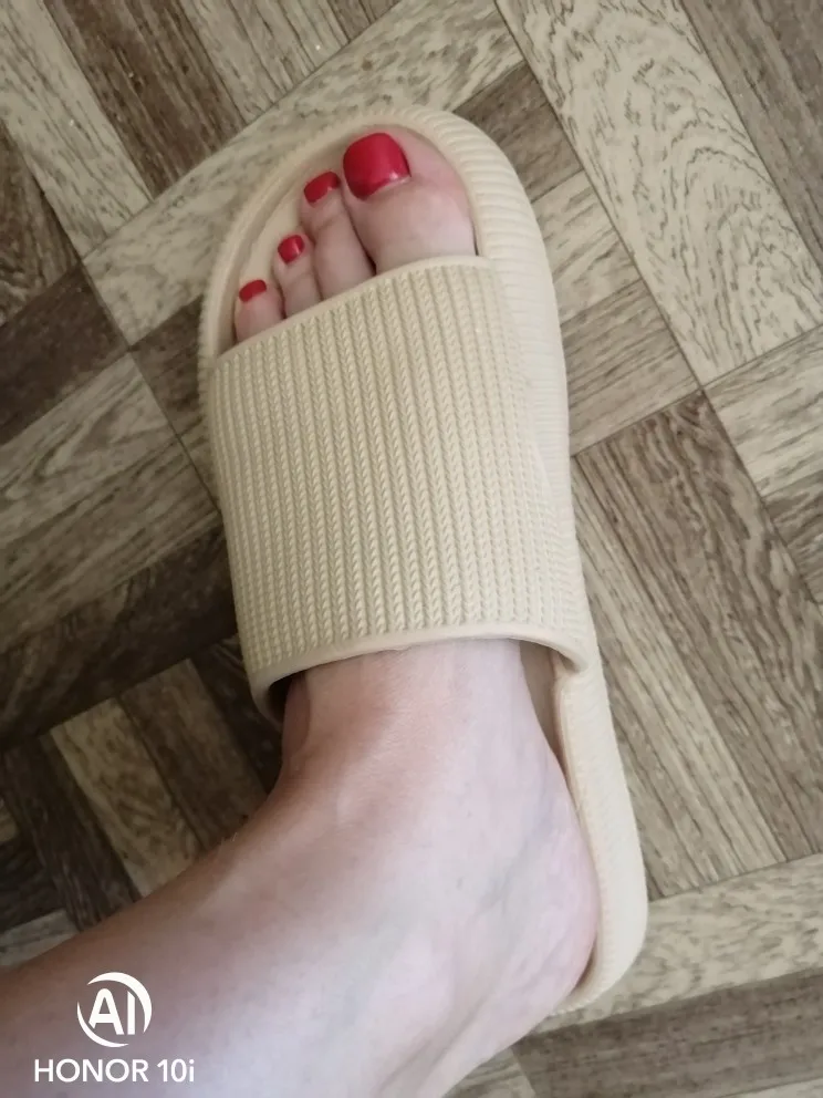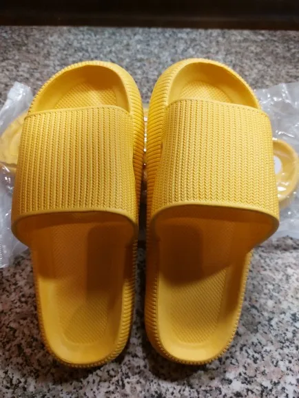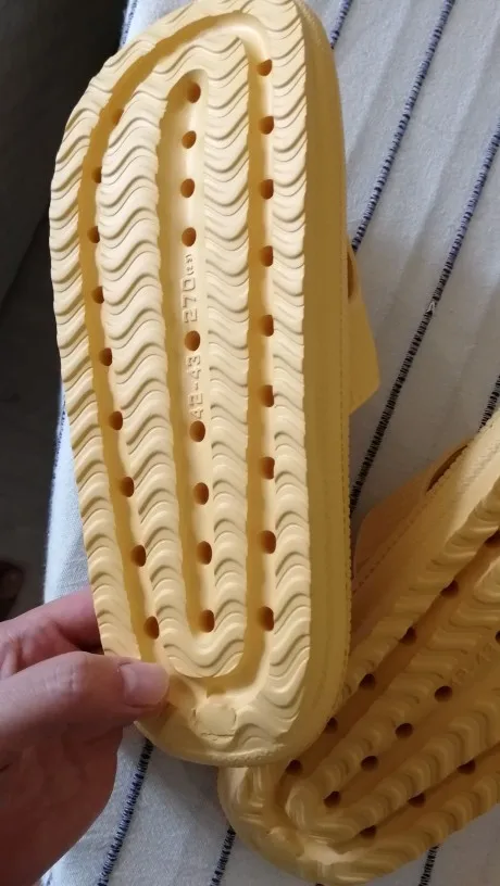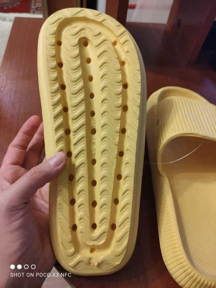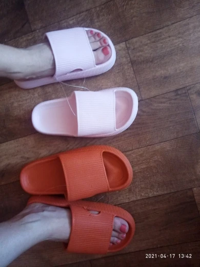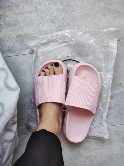 Slippers are very comfortable. I didn't even expect it. They turned out to be very soft. The sole is like an air cushion. The sole is thick, so I think, the pockets will not feel) On the foot 24,5 took 38-39, 25. They sat perfectly. My foot is wide, they do not fly out, they sit perfectly! The only negative that I noticed is an unpleasant smell. I wet them for a day, like a smaller smell. I hope that will fade. Bought on sale for 440 rubles. Arrived 17 days before the MSC. She was supposed to take it back to the Post Office. But I was called, they said that the cells in the post office were not enough, so the courier delivered the parcel directly to the house. It was very convenient! I recommend to buy!
