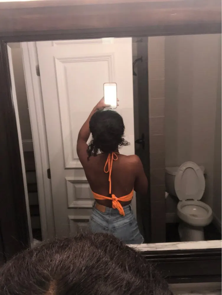 the tie straps allow for perfect fit. i’m a DDD and this looks great!