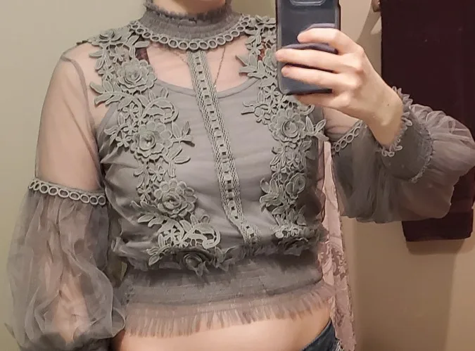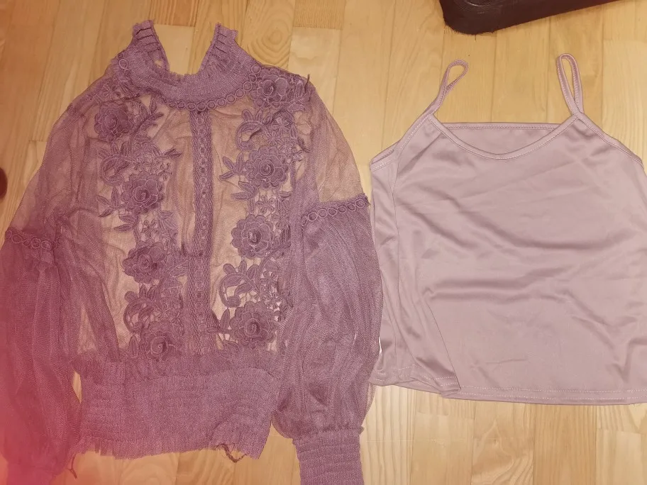 Blouse is cute, but unfortunately very short. Only suitable for sponicy and trousers with high waist. Comes bundled with a shirt on straps under out of. IN gratisie eraser
