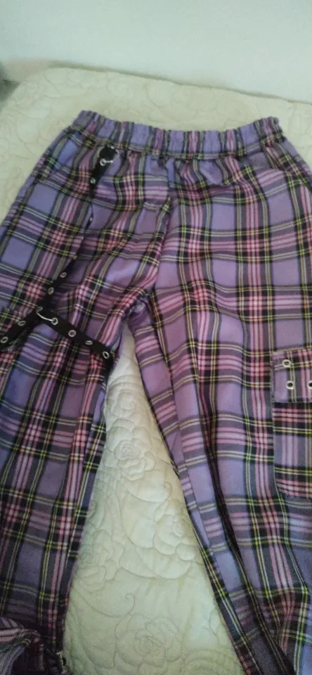 Women Streetwear Style With Pocket Chain Cargo Pants Purple Plaid JKP4785