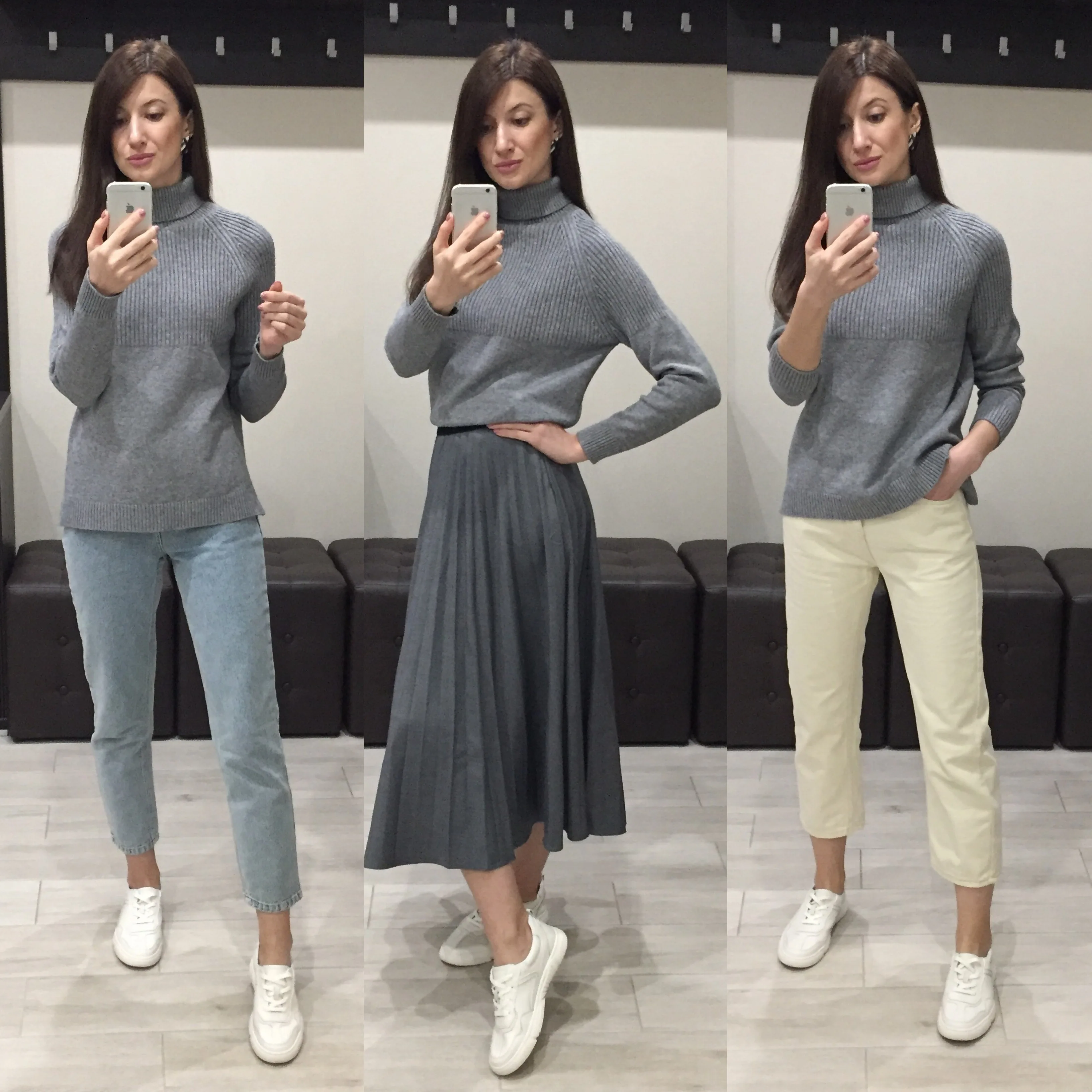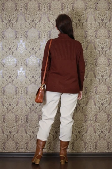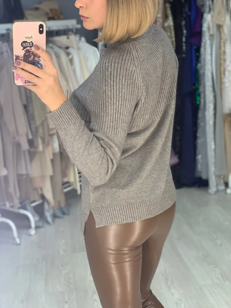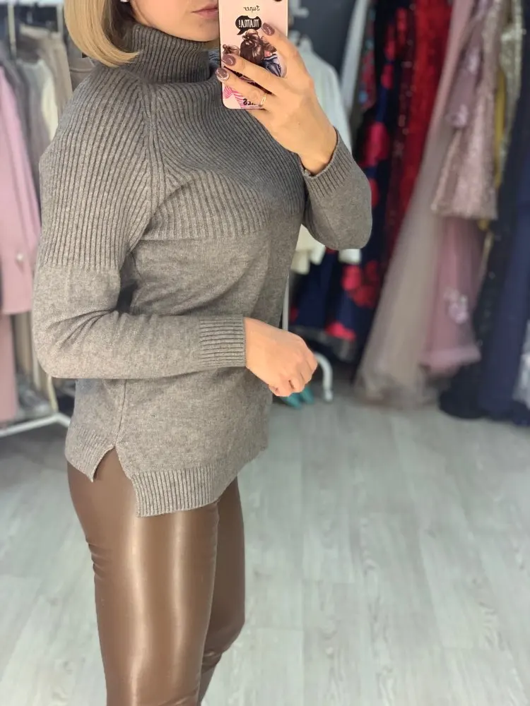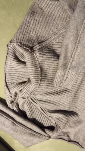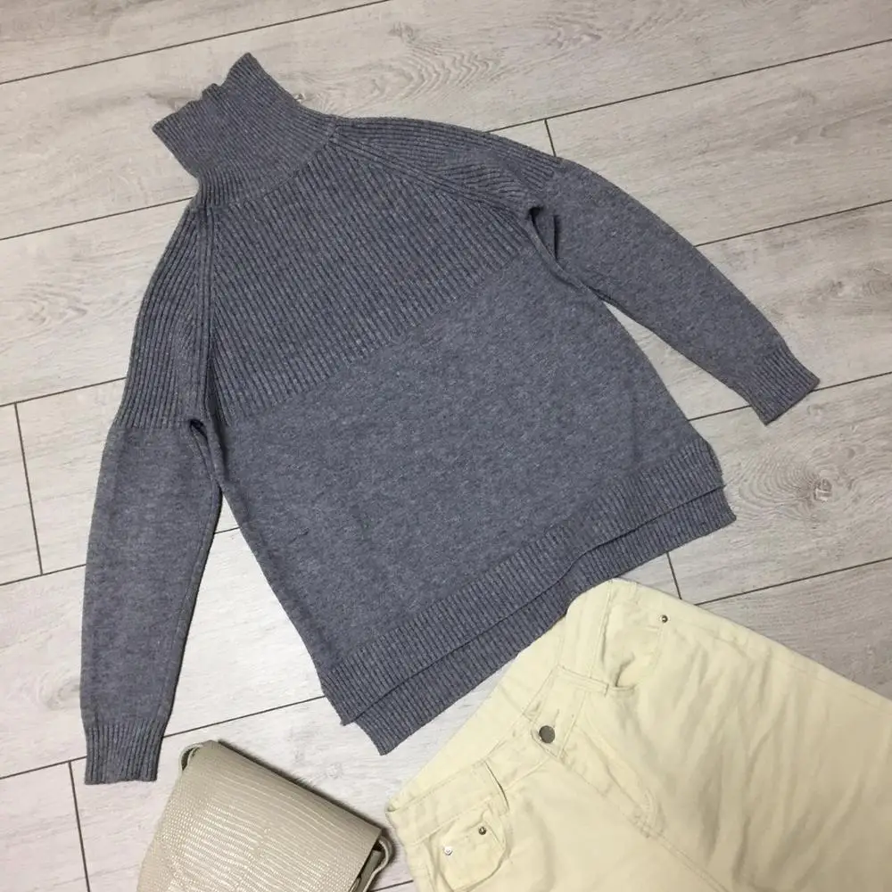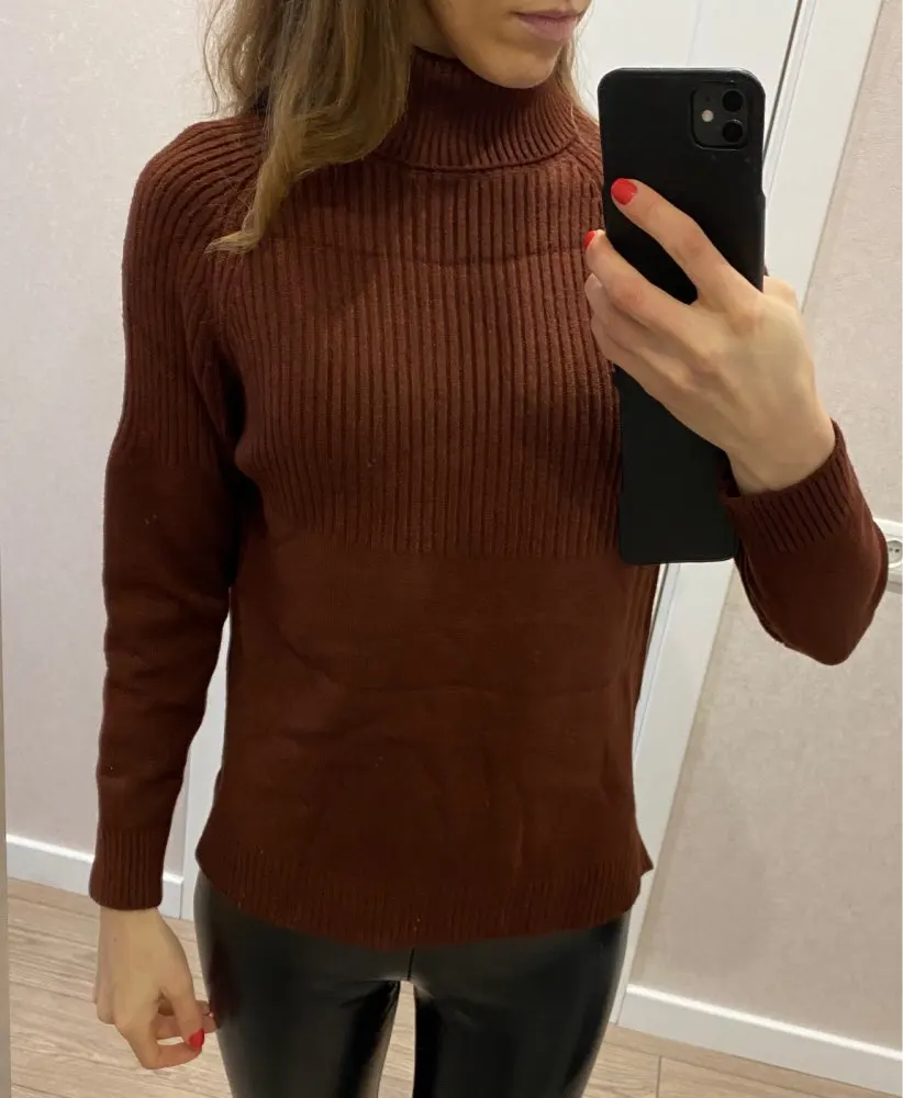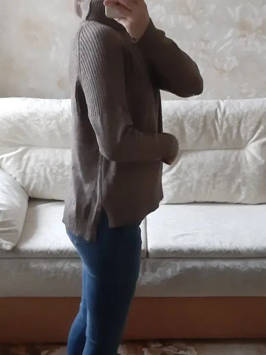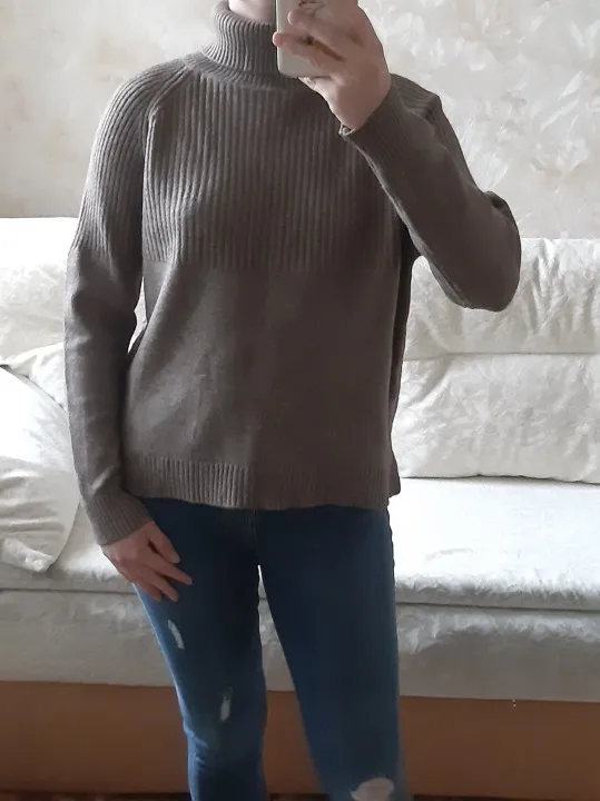 Thanks to the combination of two types of knitting and the fact that the front part of it is longer than the back, the sweater looks interesting. Thick enough and warm. The gray color was very beautiful, with a cold shade. A single size sat on my parameters freely, but the length of the sleeve back to back. I do not recommend growth higher. My parameters: 83-63-90 and height 169 cm.