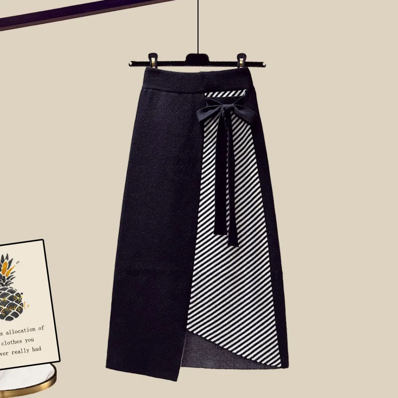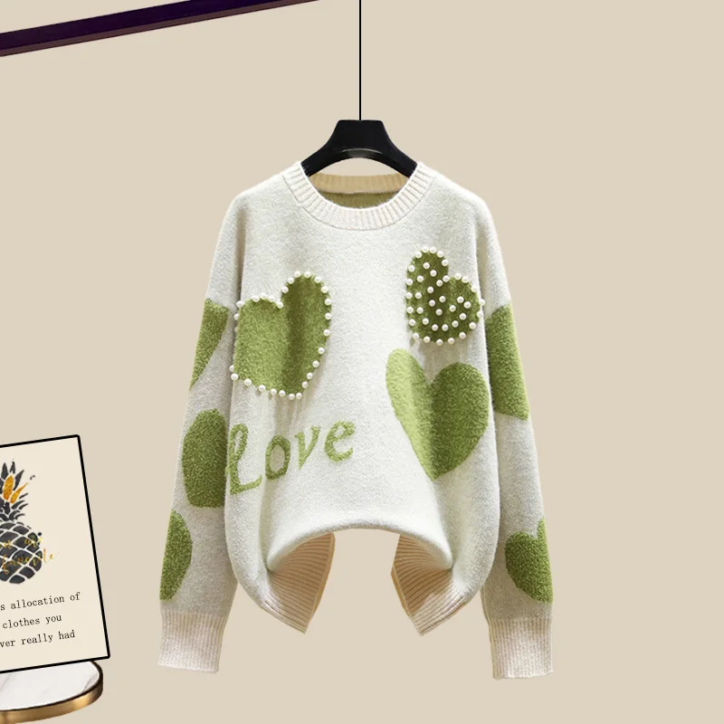 Women Sweet Heart Shaped Beaded Pullover Jumper Top And Irregular Striped Skirt Knit Sweater Two Piece set JKP5876