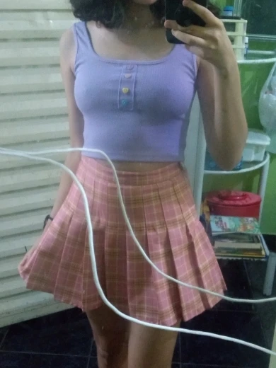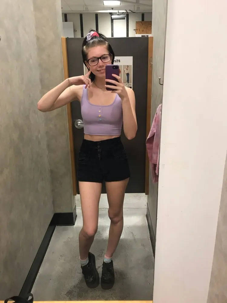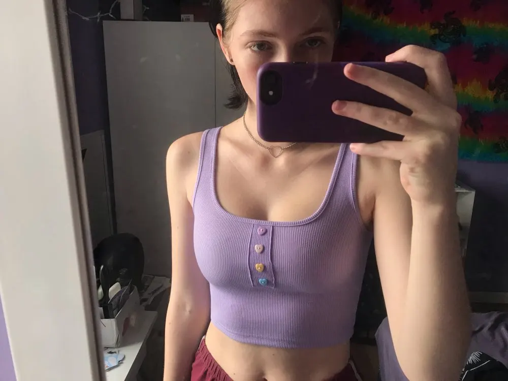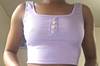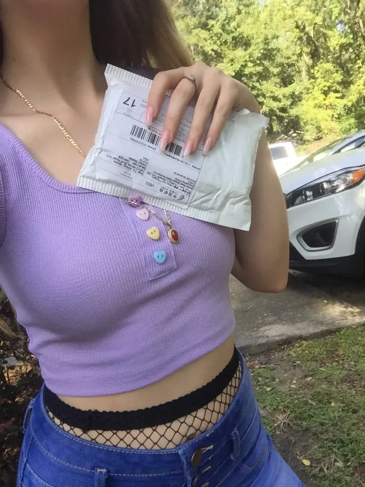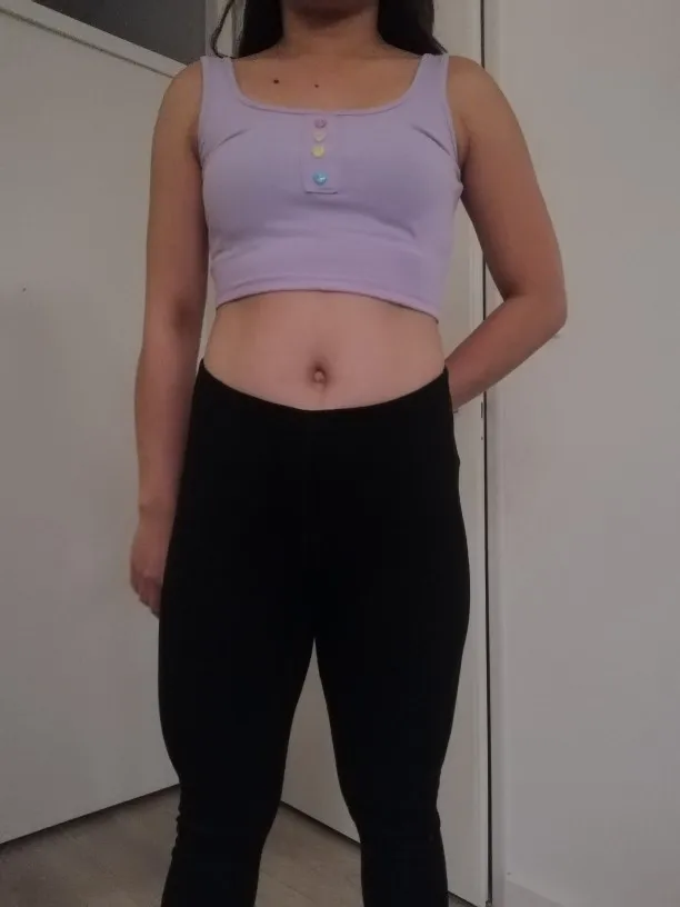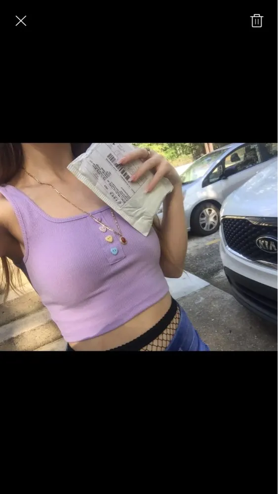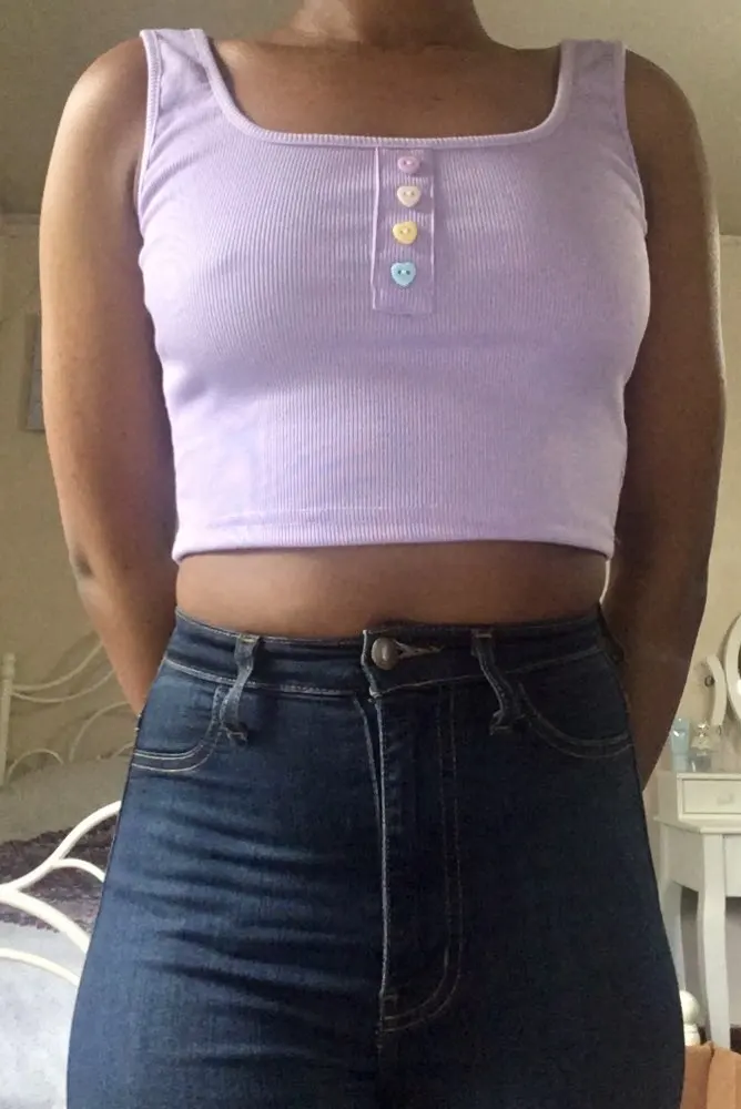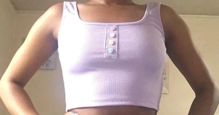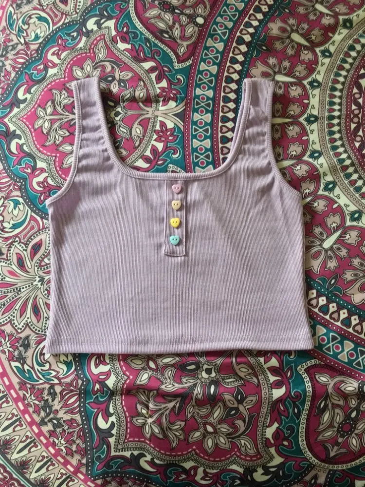 This top is mostly polyester but it’s thicker and ribbed so it’s a really nice feeling material! A bit stretchy but solid, comfy. I wear a 34C bra, I’m 5’10” and 120 lbs and I got a size small. It flattens my boobs a bit but I wanted it like that, if you don’t then go a size up so it’s looser. Nice cut, no flaws other than that the threads on the buttons were a little loose. This top is my favorite color, I wanted the sugar thrillz version so badly but it’s like $30 and this is $6, and they had the same material type listed so I figured why not. No regrets, this is a great knockoff!