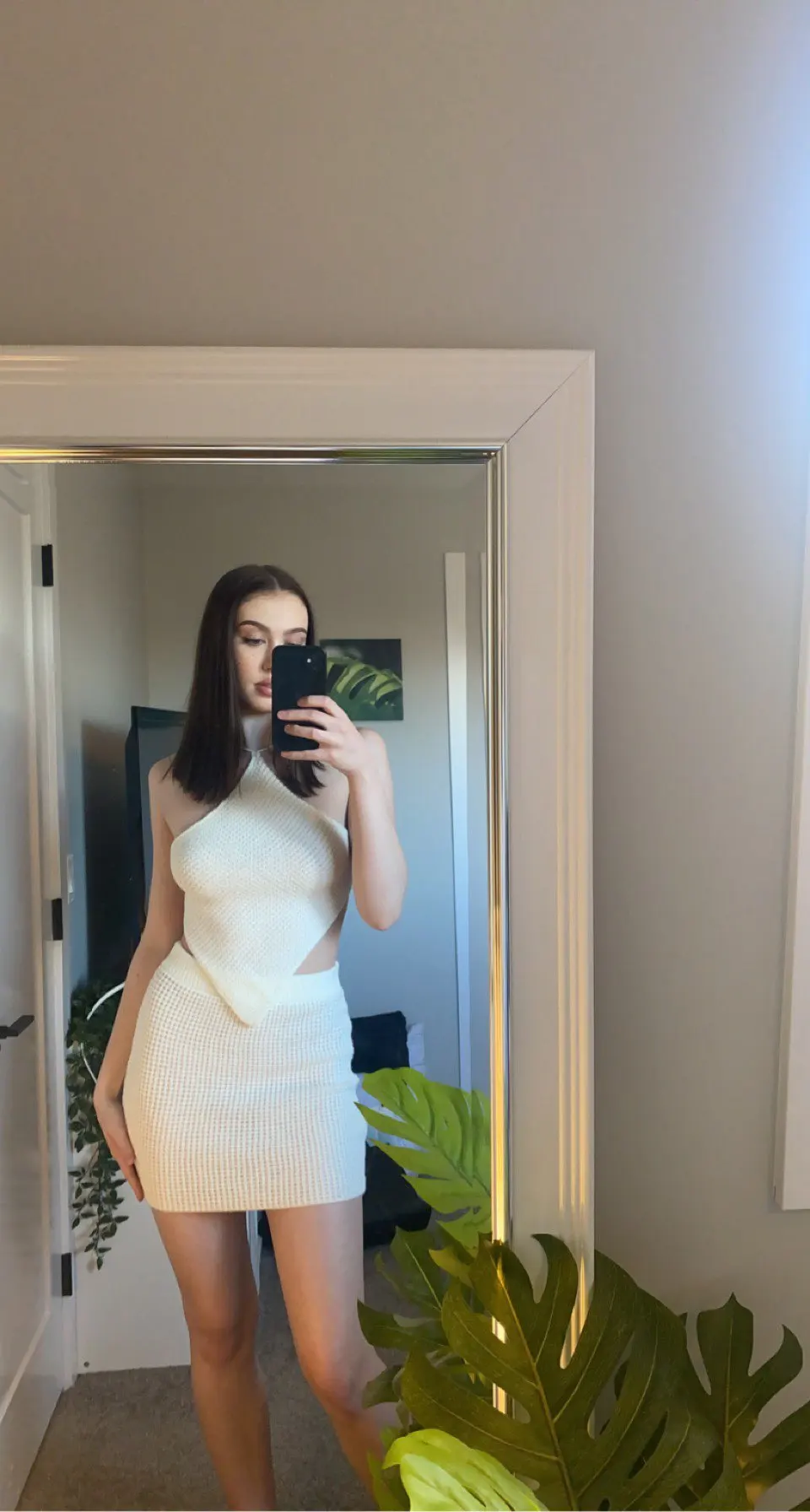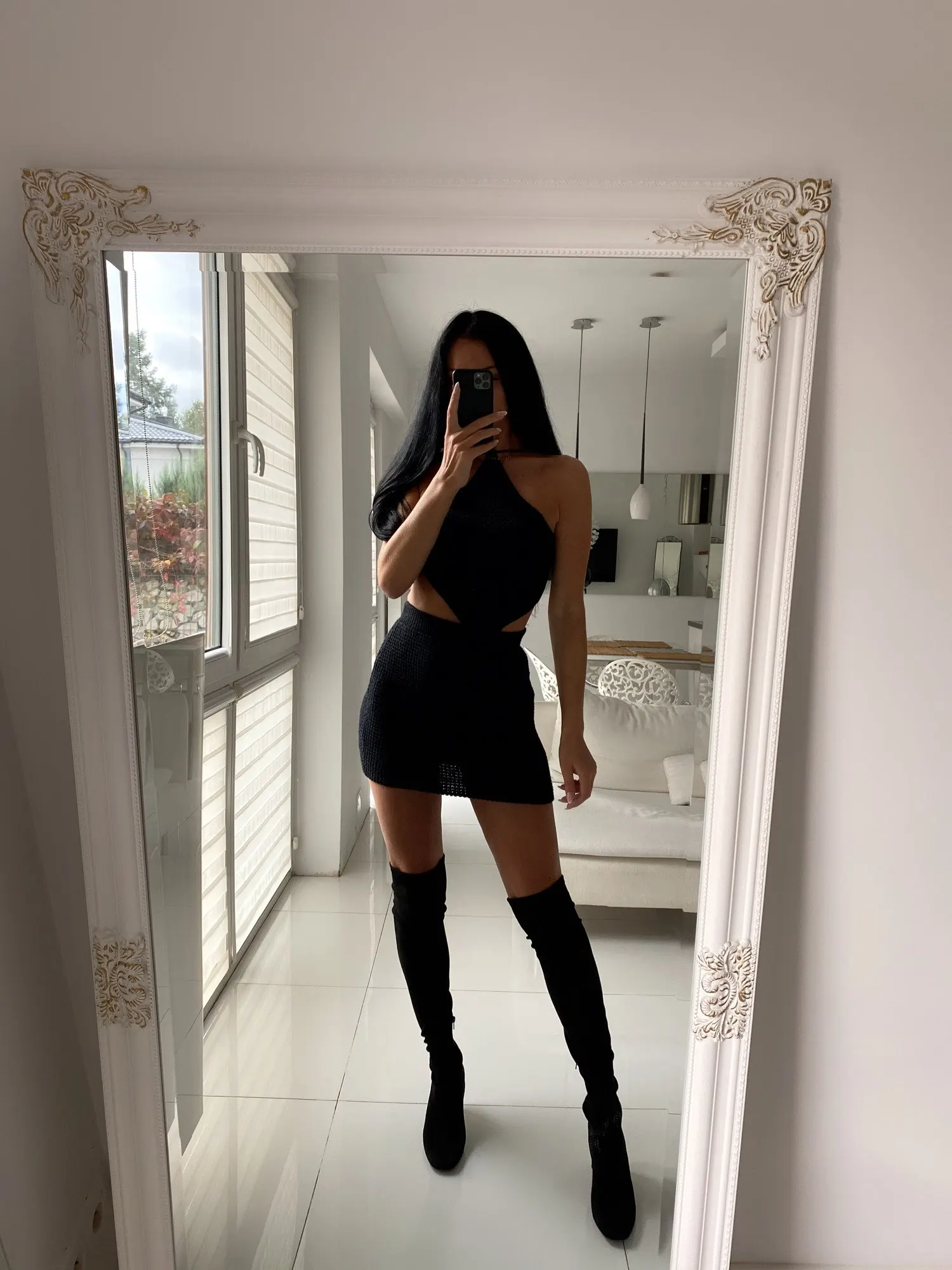 Wonderful dzianinowy set. Top wiązany, fitted mini with a high waist. Set is of great quality. I wearing size M my parameters 88/68/92 174 cm tall.