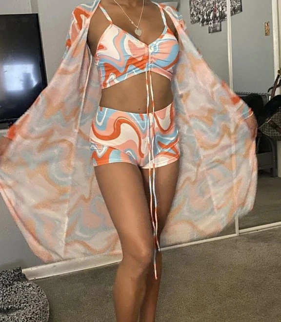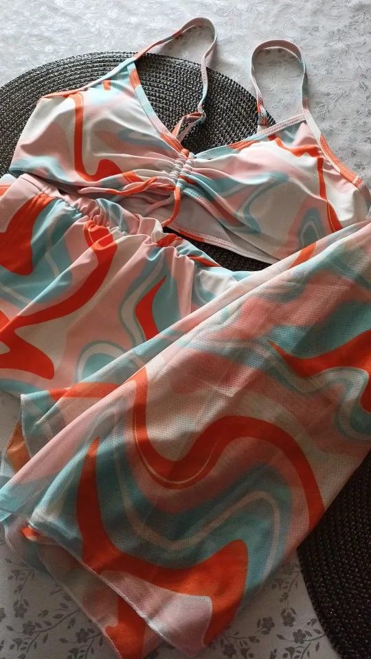 The top of this swimsuit has a compact cup, which well fixes the chest and the shoulder strap in front of the chest. The underpants are high. This tunic is light and short. It matches well with swimwear. Printed on swimwear and tunic.