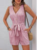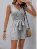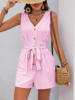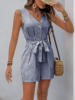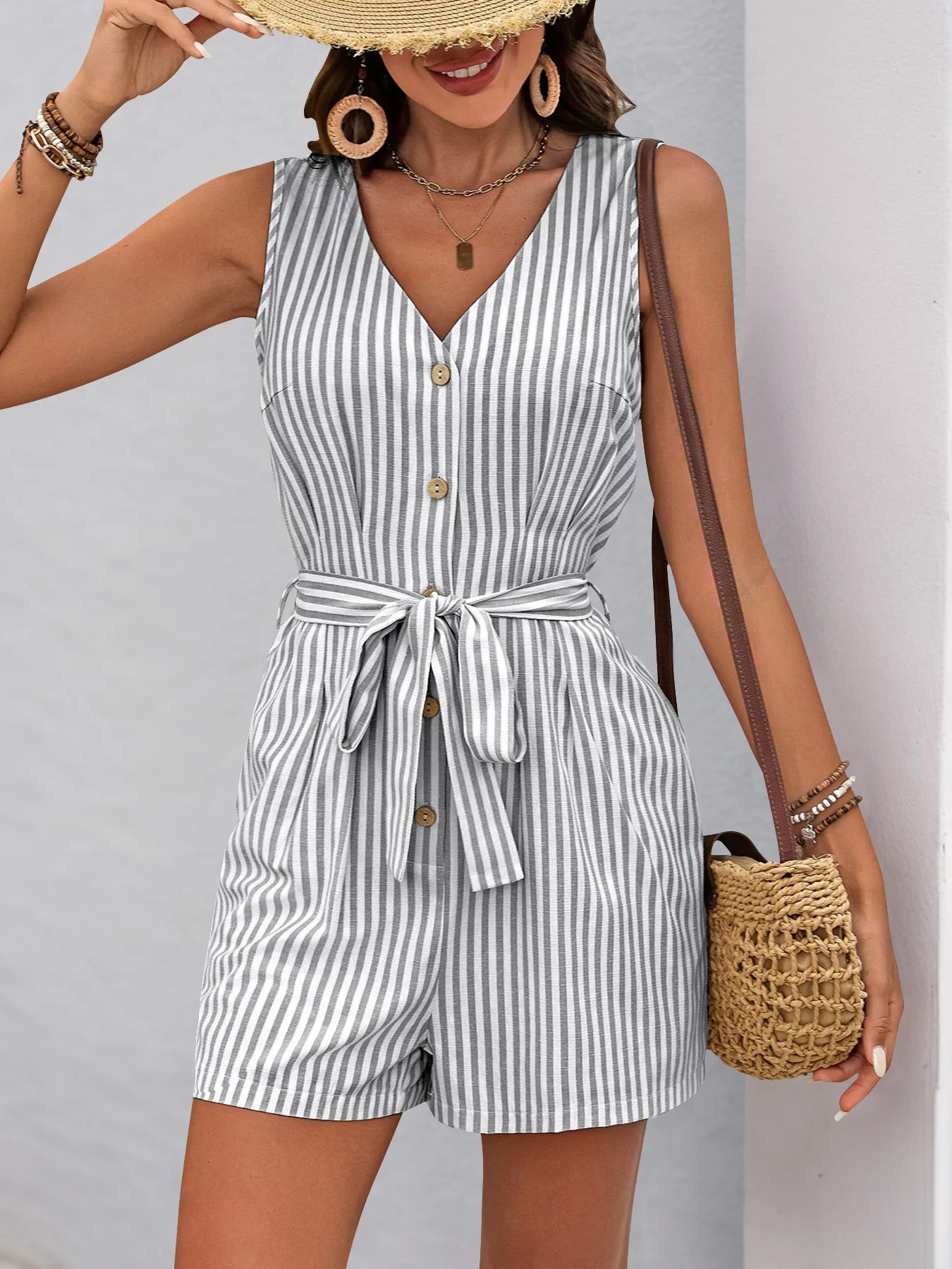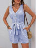 Women V-Neck Striped Sleeveless Romper Belted Waist Button Front JKP7375