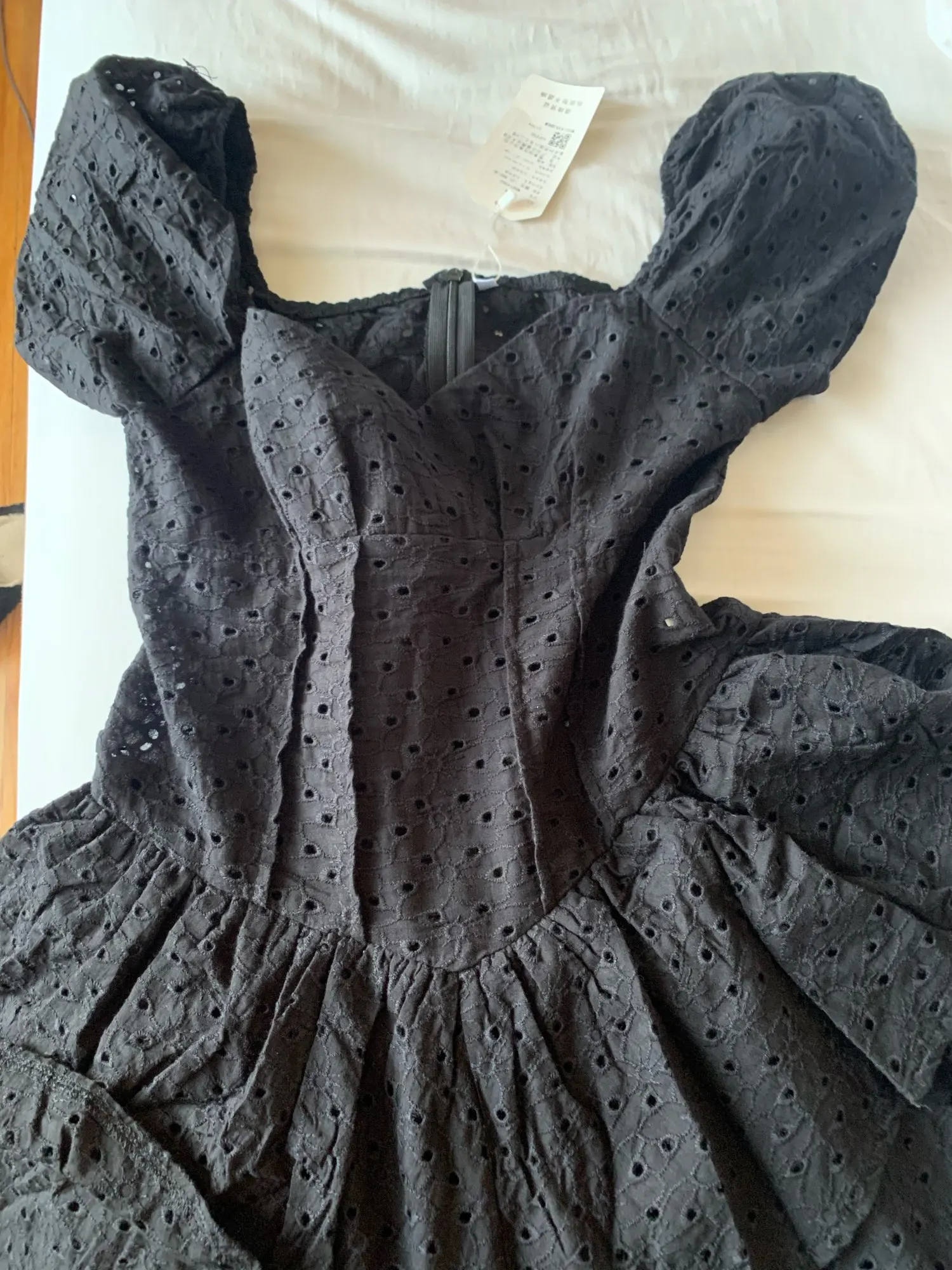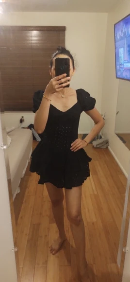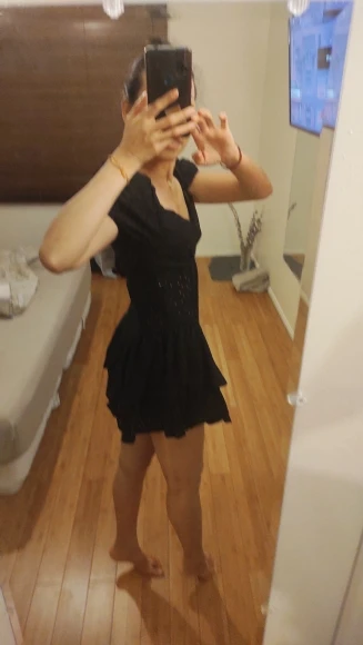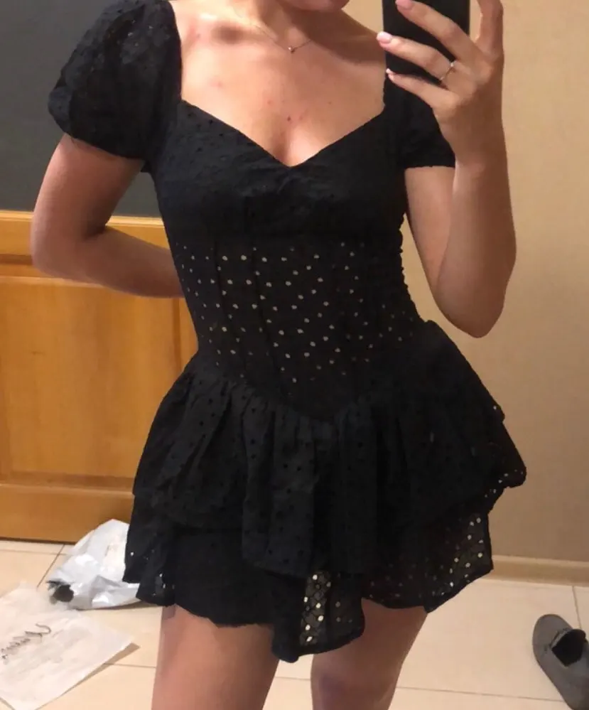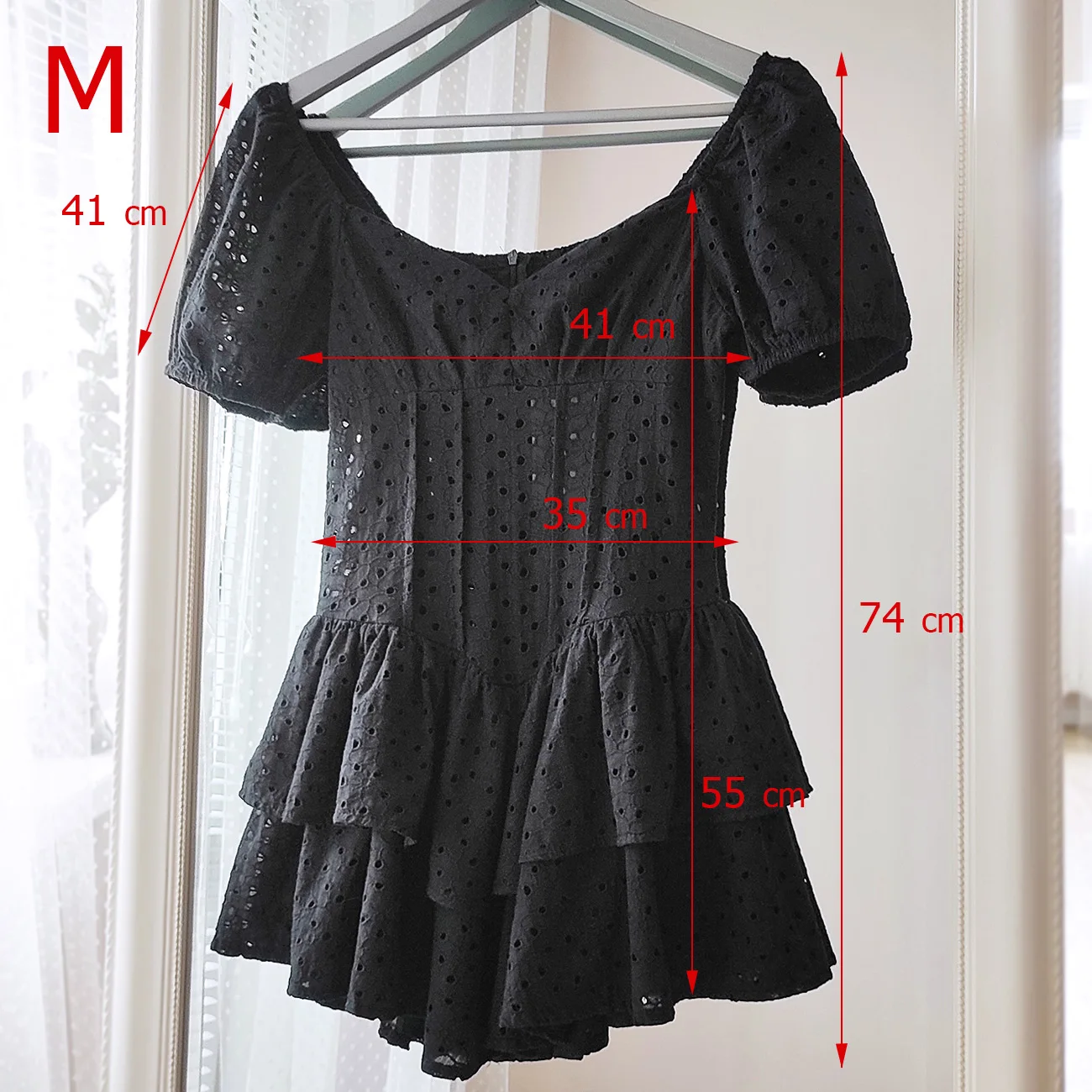 Very beautiful dress, sewn perfectly! The size M sat perfectly on the parameters 85/66/96 height 160 cm. (in the chest only slightly freely, if without a bra). Area of the bodice with lining fabric. Of the same fabric, shorts are sewn. The dress is very short in style, the shorts are needed here. It is fastened to a secret zipper on the back. Sleeves-lanterns on soft elastic bands. The skirt is lush, in two tiers. Exactly as in the photo of the store. The material is cotton sewing. Shorts-artificial, very elastic, thin fabric. (By the way, polyester and spandex are listed on the tag, it seems that this is the composition of these very shorts). The dress is excellent for parties, I do not see any other application in black) Approximate measurements in the photo. All the details in Inst-iren_ka_ali, T. me-irenka_ali, Facebook - Irenka.Ali, video-unpacking y.