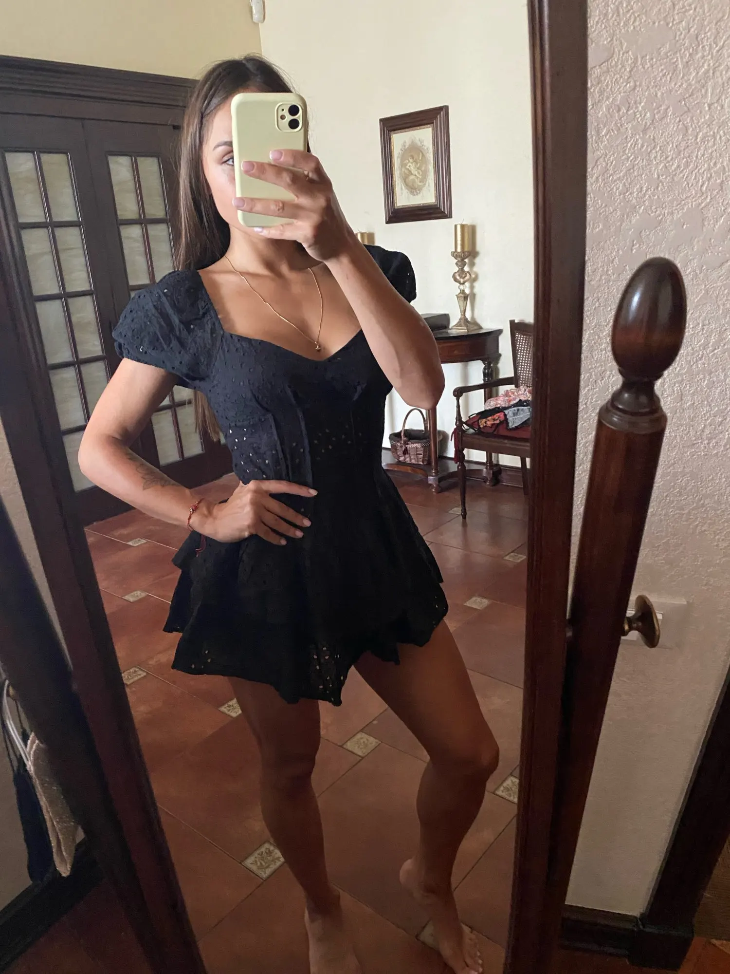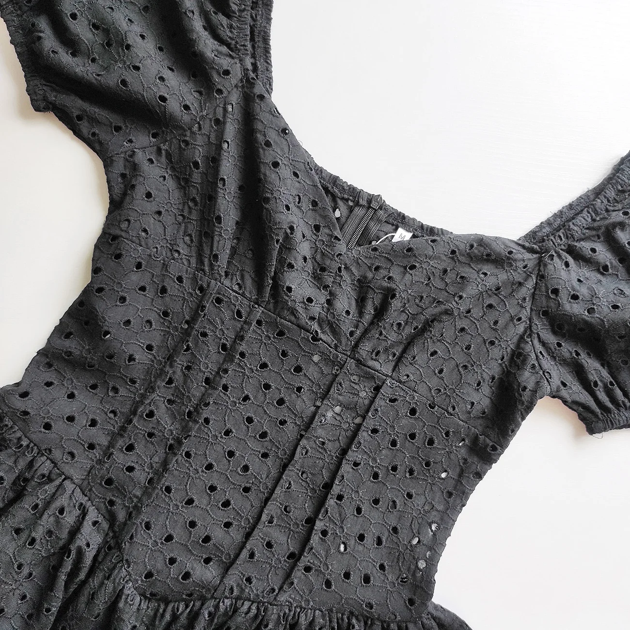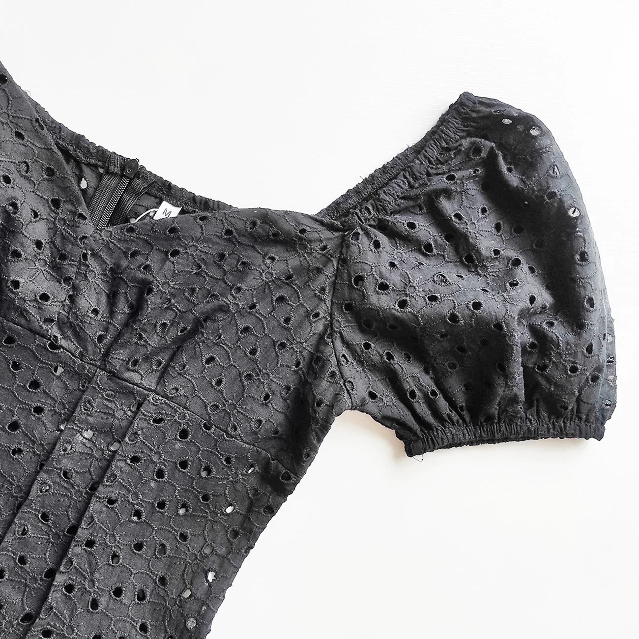 Very beautiful dress, sewn perfectly! The size M sat perfectly on the parameters 85/66/96 height 160 cm. (in the chest only slightly freely, if without a bra). Area of the bodice with lining fabric. Of the same fabric, shorts are sewn. The dress is very short in style, the shorts are needed here. It is fastened to a secret zipper on the back. Sleeves-lanterns on soft elastic bands. The skirt is lush, in two tiers. Exactly as in the photo of the store. The material is cotton sewing. Shorts-artificial, very elastic, thin fabric. (By the way, polyester and spandex are listed on the tag, it seems that this is the composition of these very shorts). The dress is excellent for parties, I do not see any other application in black) Approximate measurements in the photo. All the details in Inst-iren_ka_ali, T. me-irenka_ali, Facebook - Irenka.Ali, video-unpacking y.