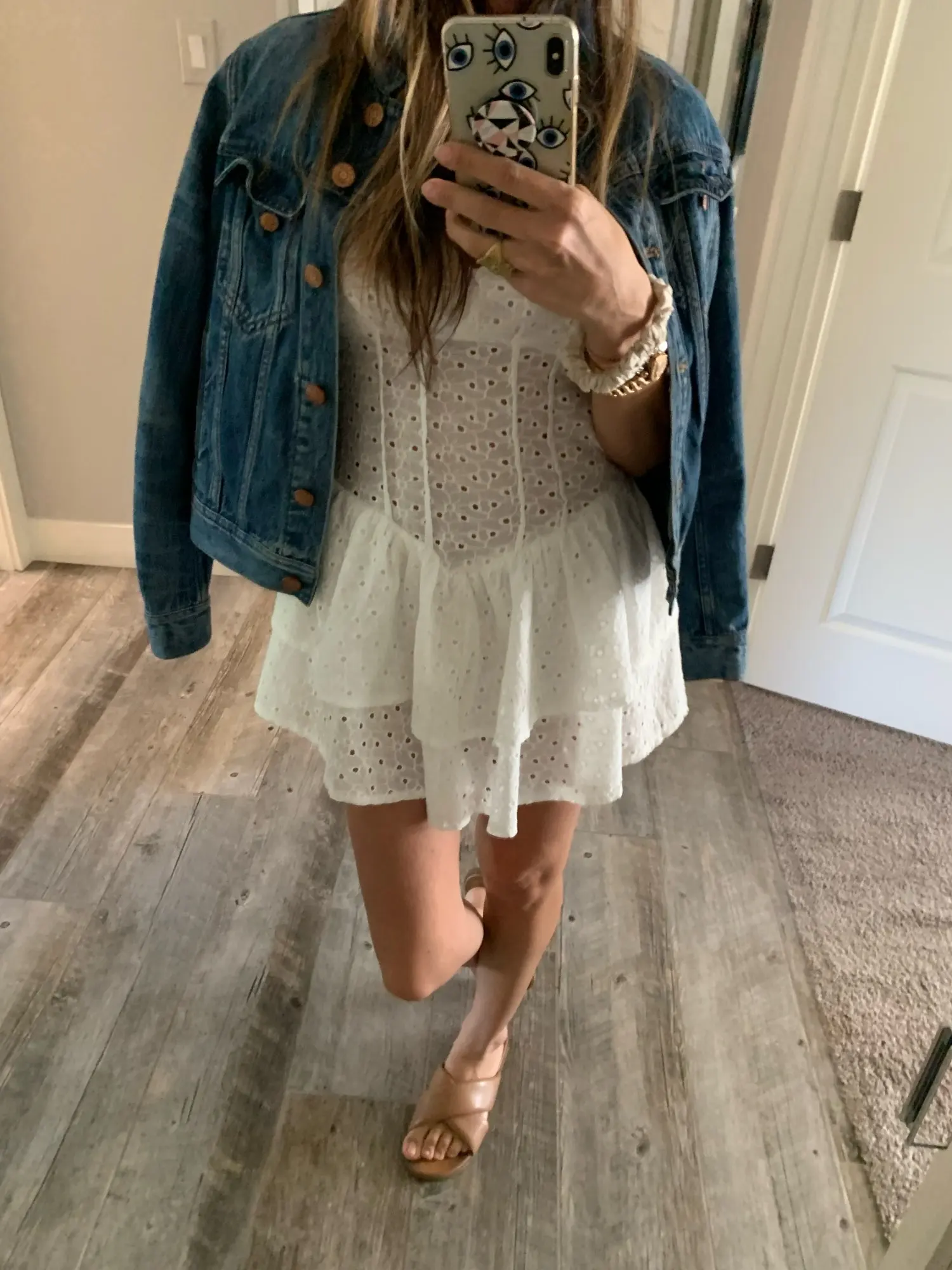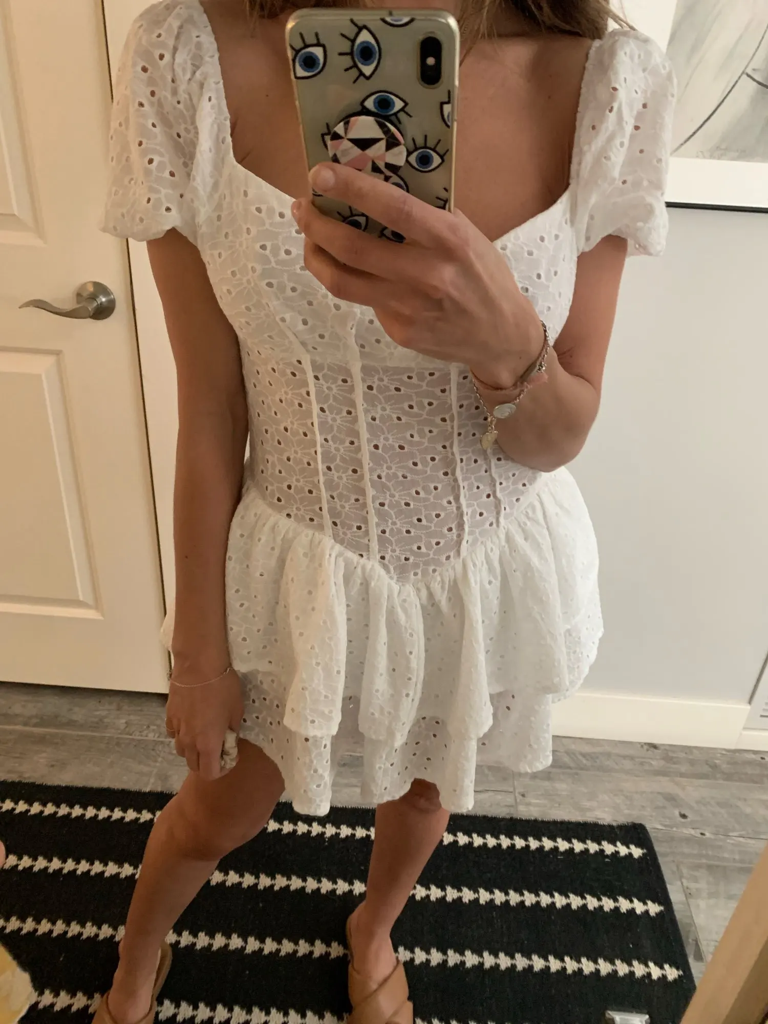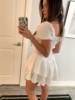 I have this in black M and I liked it so much I got it in white. It’s just so easy to wear and easy to dress up or down. The white seemed to have some thread piling but nothing that was noticeable. For reference I got the size M, it could be tighter but I don’t mind the fit — it doesn’t look large. I’m 116lbs, 34C, 27” waist and 5”6 for reference. I didn’t think it was too short either, it’s cute!