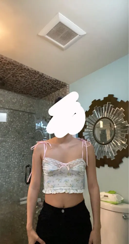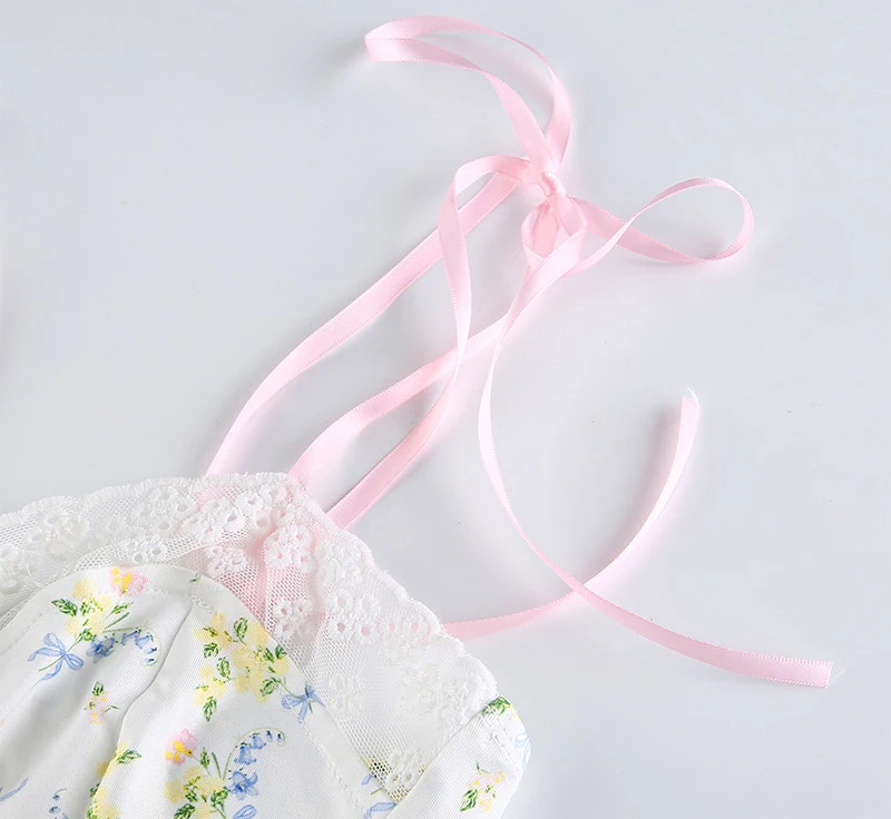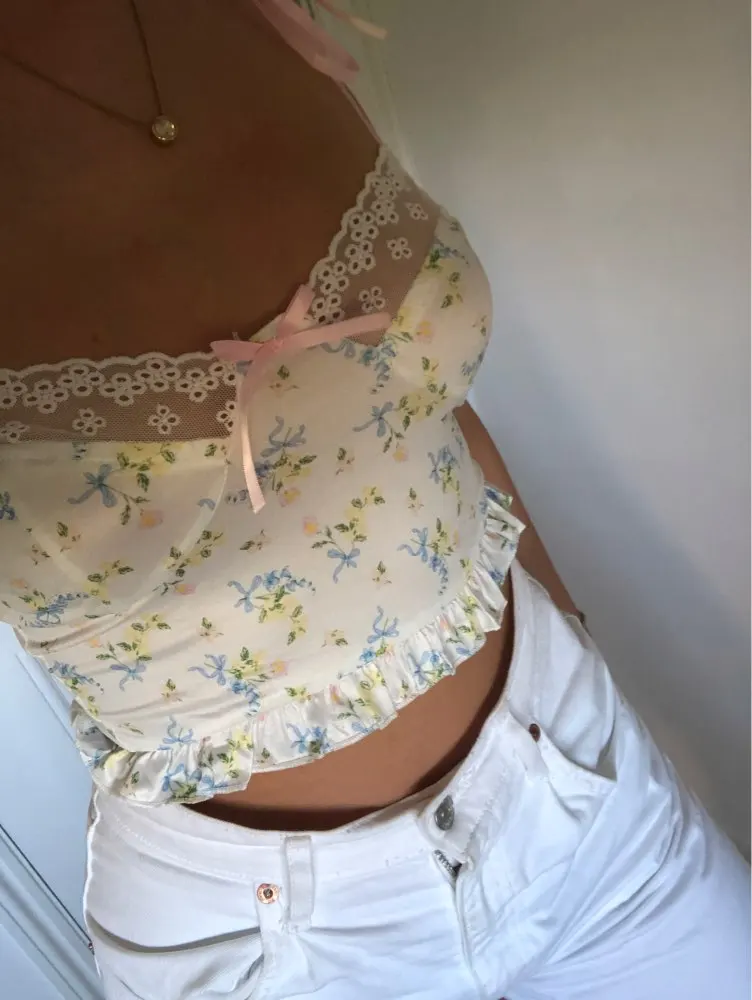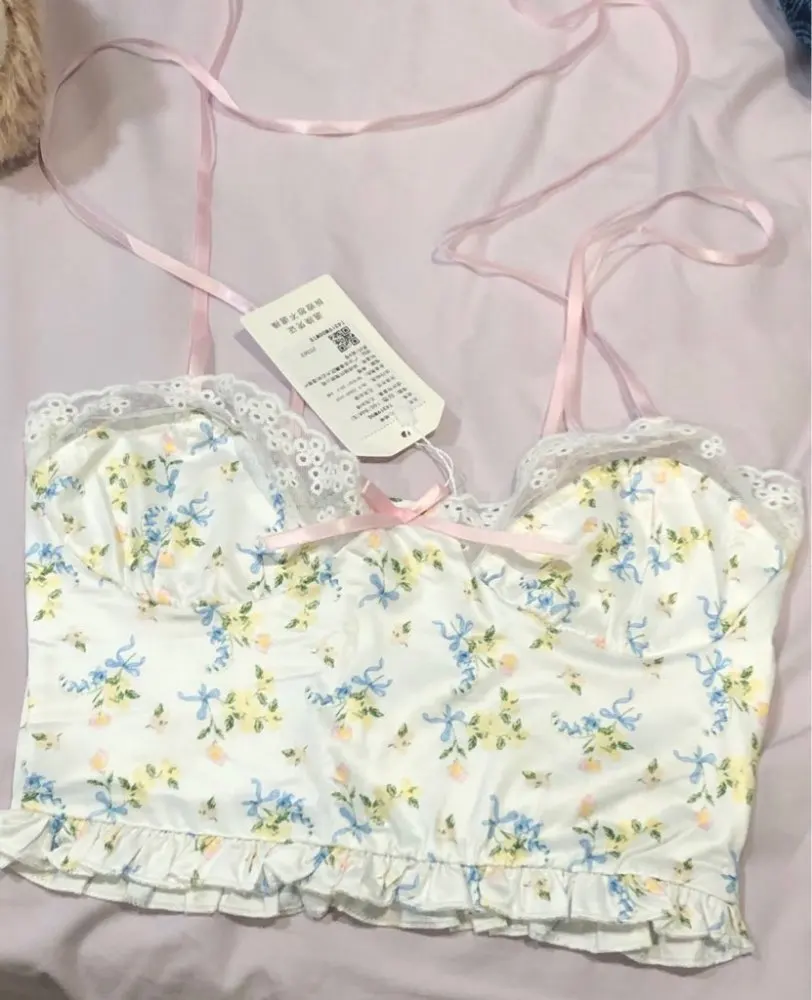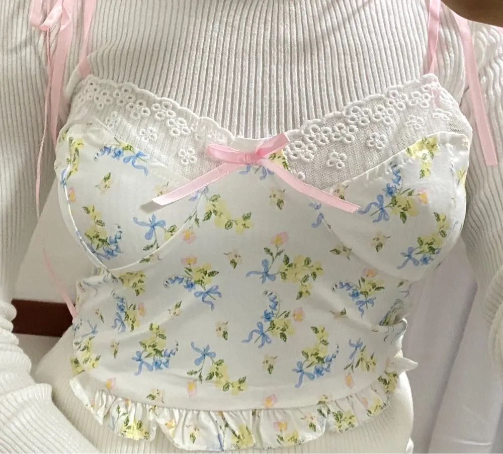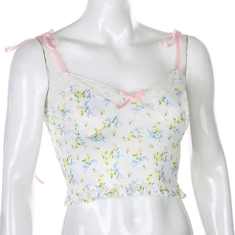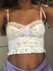 Y2K Crop Top Frill Lace Floral Print Women Cute Camis Top Backless Casual